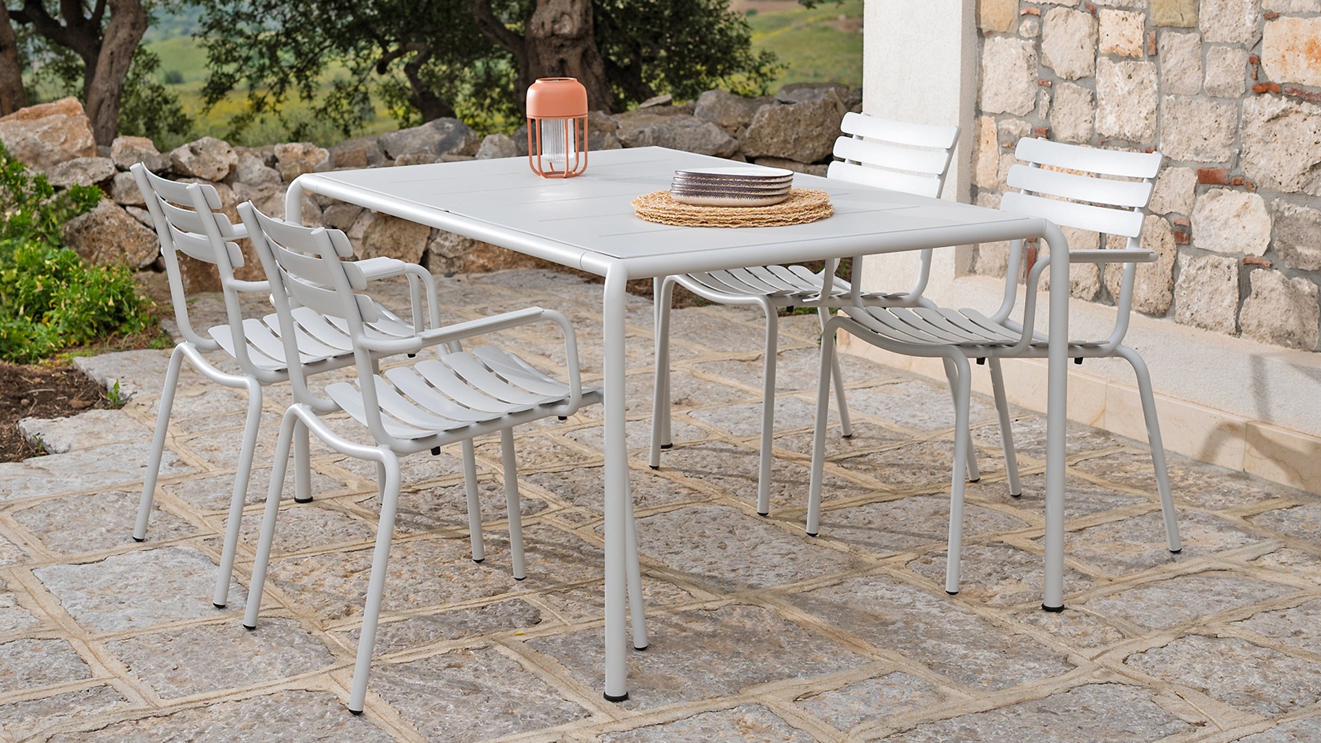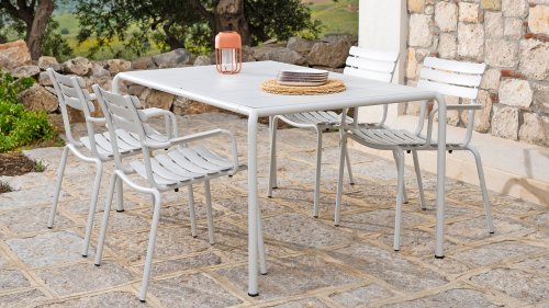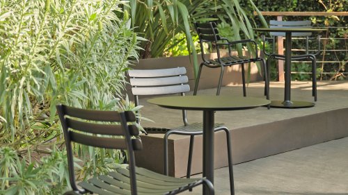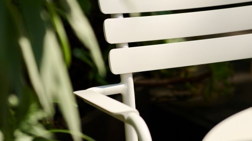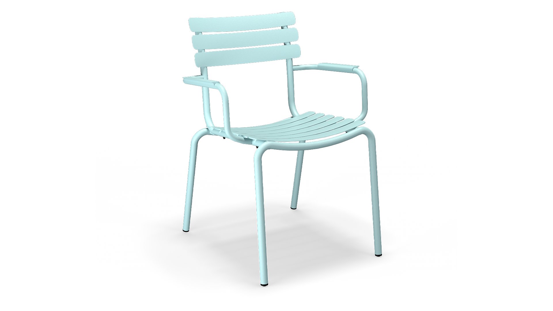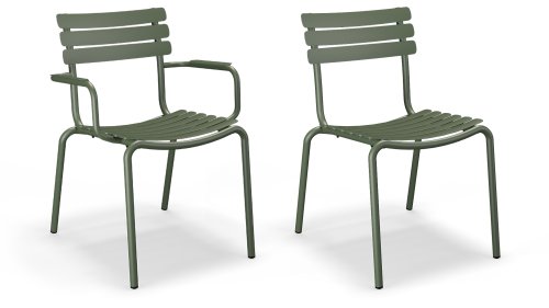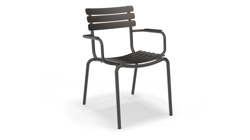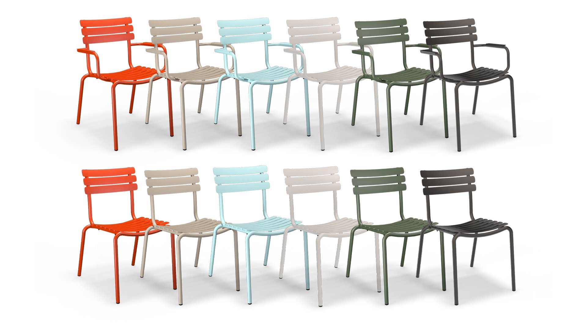 ALUA is verkrijgbaar in 6 kleuren: Muted White / Black / Beige / Cayenne / Ice Blue / Olive Green en biedt de keuze tussen modellen met of zonder armleuningen. Ontworpen voor eenvoudig stapelen, kan tot 10 stuks worden gestapeld. De gebogen aluminium latten zijn zo gevormd dat u een comfortabele zitervaring krijgt en de stoel een zachte en uitnodigende uitstraling geeft.