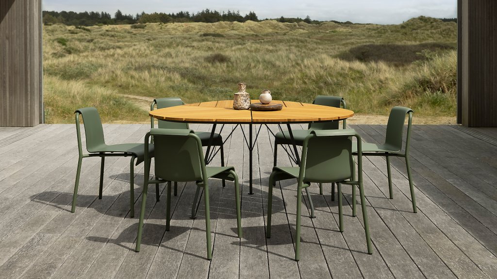 Het ontwerp van de HOUE NAMI is gebaseerd op de krachten en lijnen van de natuur en vindt bij weer en wind zijn natuurlijke plek buite. De NAMI stoel bestaat uit een gepoedercoat stalen frame met een prachtig gegoten kunststof schaal. De stoel is gemaakt in Denemarken en bevat 97% Deens huishoudelijk plastic afval en 3% kleurpigment!