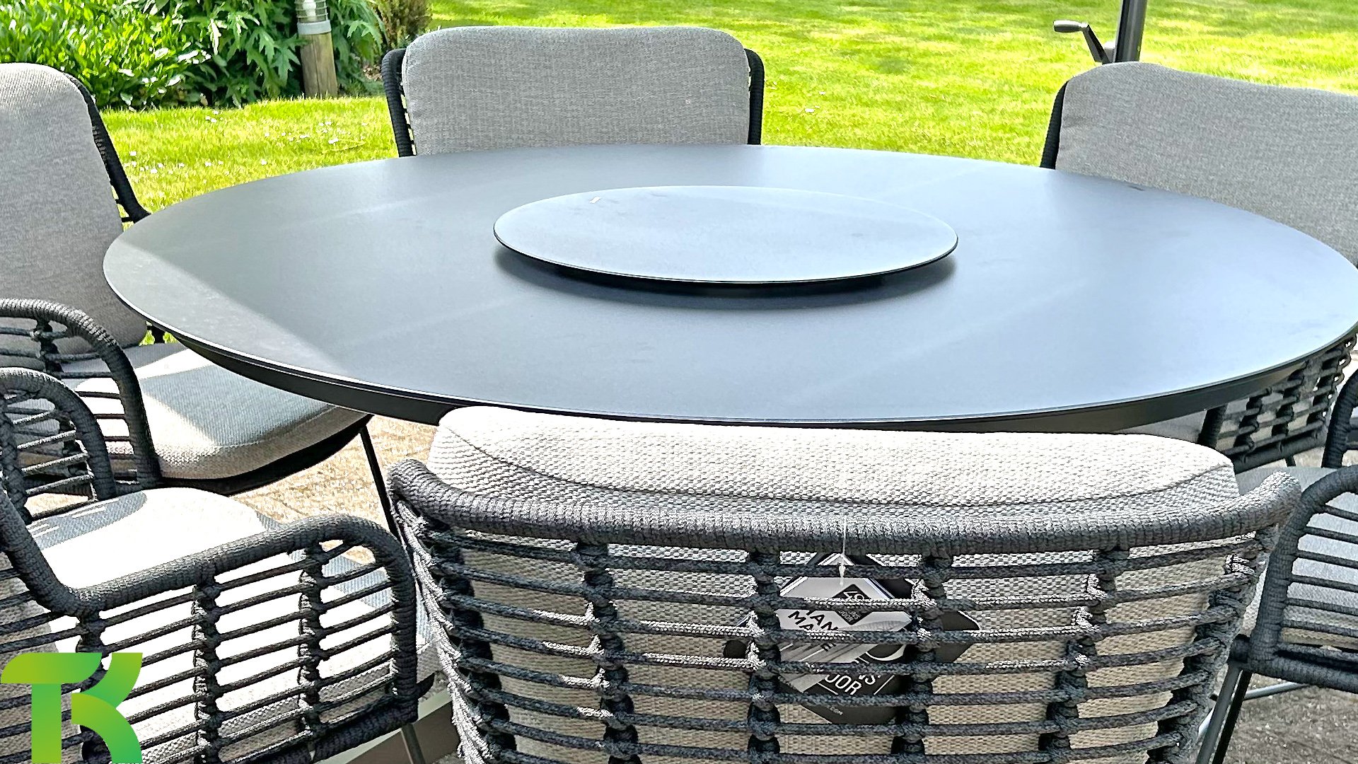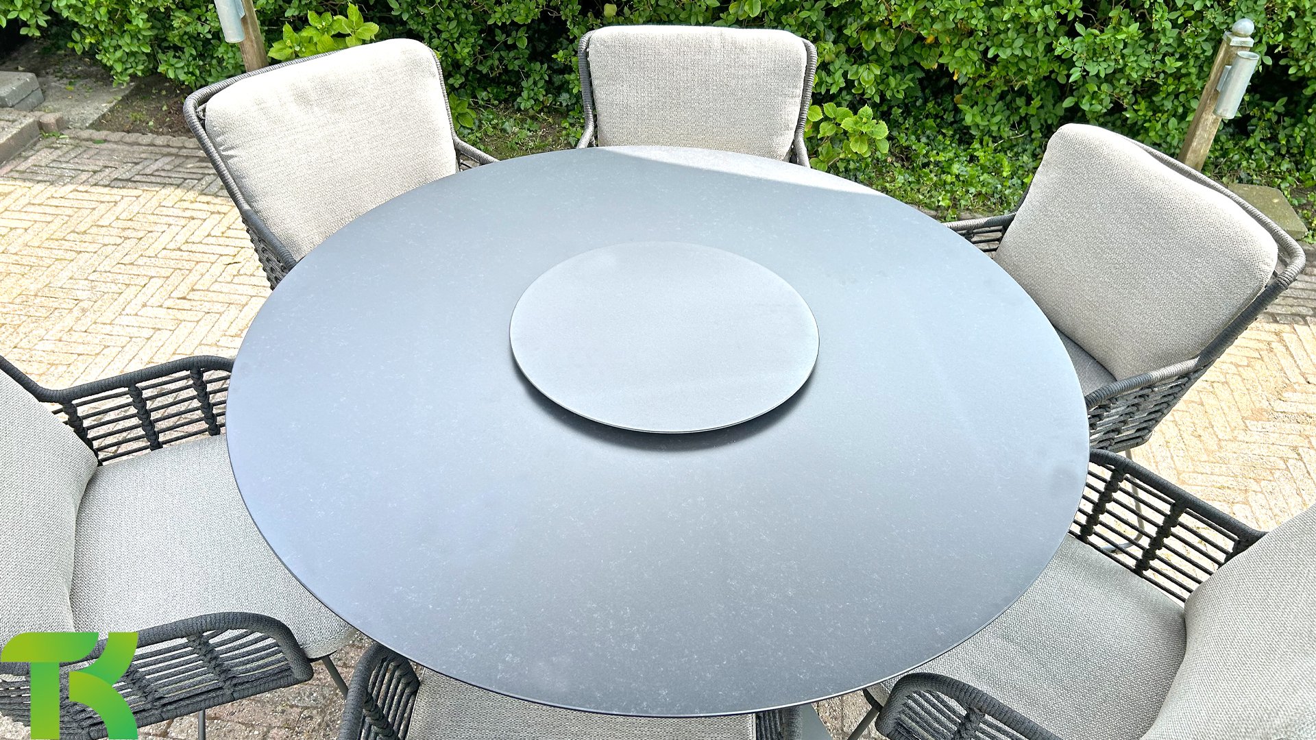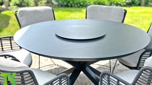 De Atalanta Ø145cm. Vervaardigd van gepoedercoated aluminium in een Antracieten kleur en een 5mm keramiek op glas tafelblad. De tafel die is zo goed als onderhoudsvrij. De tafel wordt ook meegeleverd met een Lazy Susan draaiplateau, wat ideaal is voor wanneer je visite ontvangt en iets wilt doorgeven. Deze prachtige tafel combineert functionaliteit met een stijlvol design, waardoor het de ideale keuze is voor iedereen die van buitenleven houdt.