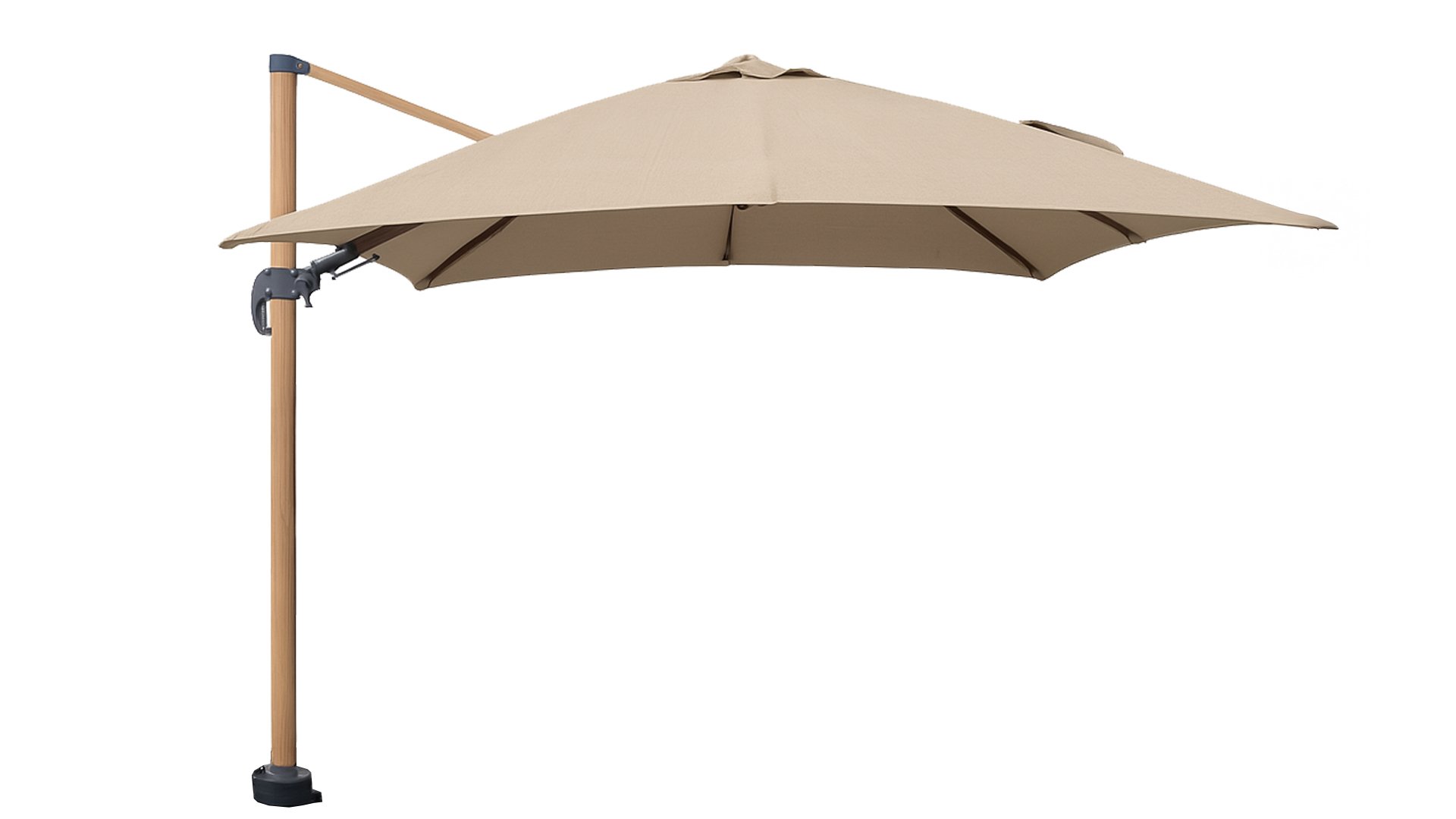 De Jamaica hangarm parasol combineert luxe uitstraling met slim gebruiksgemak. Het aluminium frame met woodlook geeft een warme, moderne look, terwijl het stevige 250g olefin doek met UPF50+ optimale bescherming biedt tegen de zon.