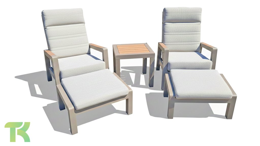 De set bestaat uit twee loungestoelen, twee voetenbanken en een handige bijzettafel, die samen een complete en praktische zithoek vormen. Elk van de loungestoelen is voorzien van polyester zitkussens waarbij de rugleuningen van de loungestoelen verstelbaar zijn via een knop in de armleuning. Hierdoor kun je eenvoudig de ideale zitpositie kiezen voor extra comfort en ontspanning. De bijzettafel van de set heeft een blad in woodlook, wat de set een natuurlijke uitstraling geeft en perfect complementeert met het moderne ontwerp van de rest van de meubels. Het woodlook blad is bovendien onderhoudsvriendelijk, wat het praktisch maakt voor buitengebruik.