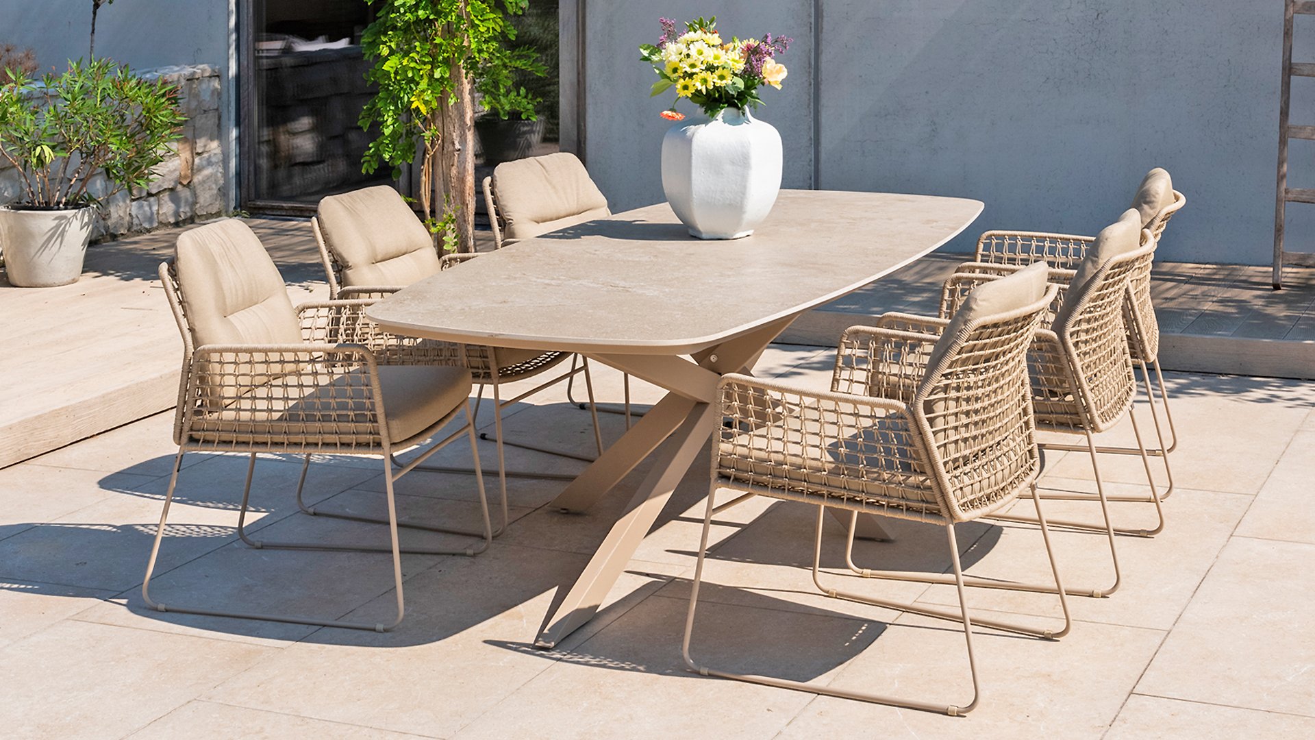 Een prachtige, elegante tafel met een schitterend ovaal keramieken blad van maar liefst 240cm of 300cm. Het blad straalt niet alleen verfijning uit, maar heeft ook een opvallende, moderne uitstraling. De opvallende kruispoot is beschikbaar in drie kleuren, waardoor je deze tafel moeiteloos kunt afstemmen op jouw wensen en behoeftes. Of je nu kiest voor indistrueel zwart, het warme latte of de chique kleur terre, elke kleur voegt een bijzonder karakter en een vleugje luxe toe aan de tafel. Met zijn royale afmetingen biedt deze tafel voldoende ruimte voor een gezellige maaltijd met vrienden of een intiem diner met familie. De combinatie van het verfijnde keramiek en de sterke, stijlvolle poot zorgt ervoor dat deze tafel niet alleen functioneel is, maar ook een verbluffend statement maakt in jouw tuin.