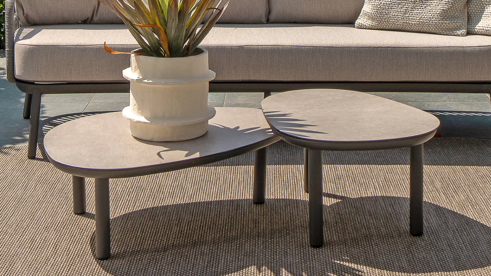 Breng een vleugje elegantie en verfijning in je zithoek met de Monroe salontafelserie van Taste by 4 Seasons Outdoor. Deze prachtige set bestaat uit twee organisch gevormde tafels met kiezelvormige bladen – speels, maar toch perfect in balans. Dankzij het onderscheidende design vormt Monroe het stijlvolle middelpunt van elke buiten- of binnenruimte.