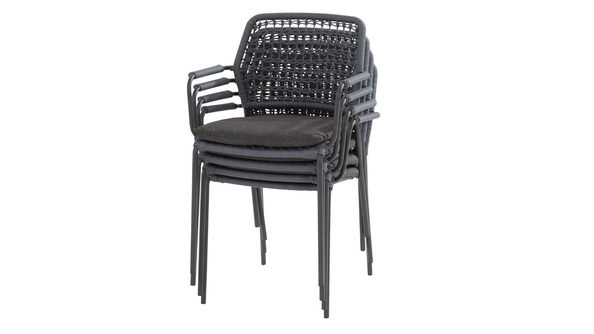 Deze stoel is er in 3 kleuren: Antraciet, Terre en Latte. Het rope materiaal is weerbestendig en in een blok-patroon geknoopt waarbij het op subtiele wijze ook weer terug komt in de armleuningen.