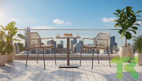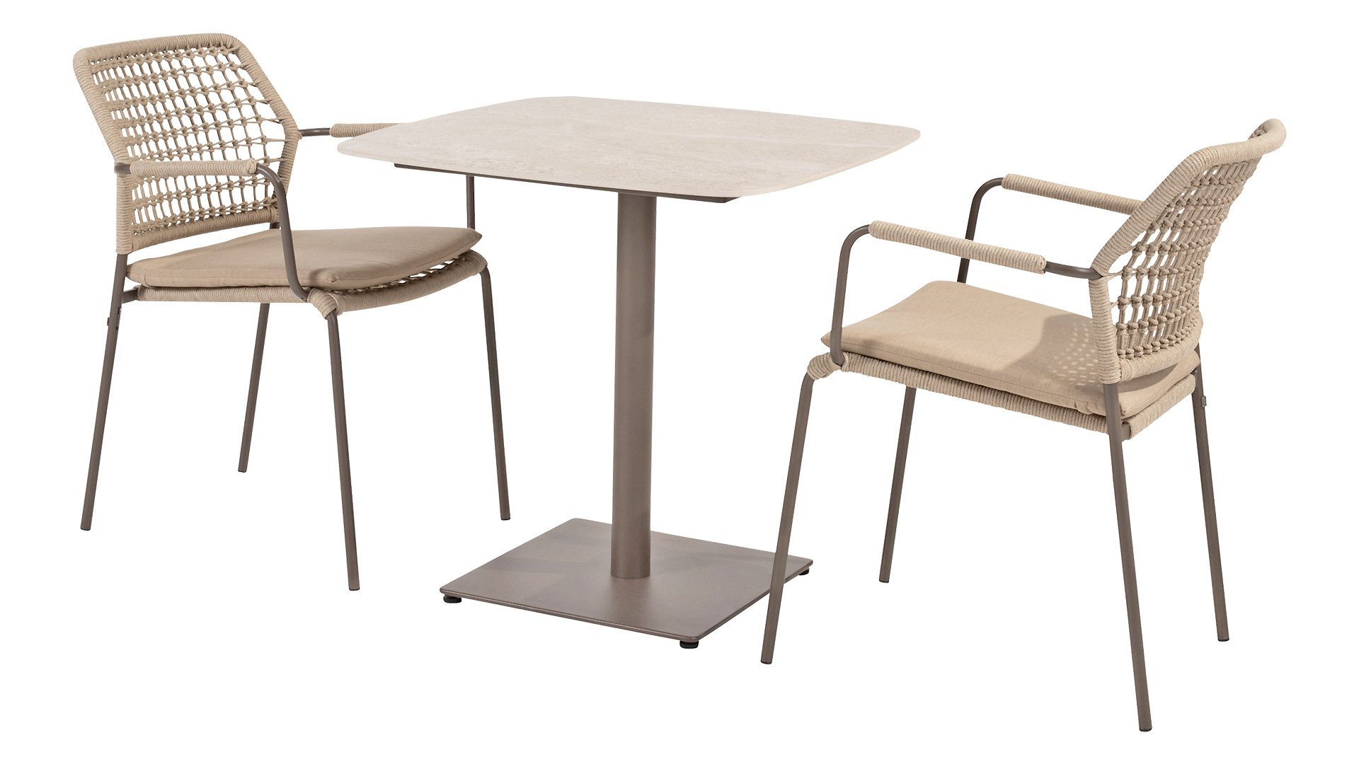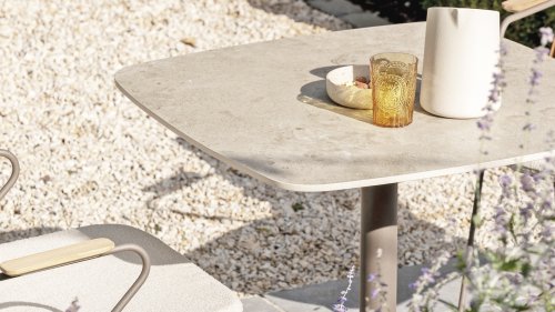 Deze tafel van 75x75 cm heeft een elegant keramieken blad dat zowel stijlvol als praktisch is. Het keramiek is niet alleen duurzaam en gemakkelijk schoon te maken, maar biedt ook een luxe uitstraling. Het onderstel is in een warme, aardse tint genaamd terre, die perfect aansluit bij moderne en rustieke interieurs/tuinen.
