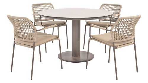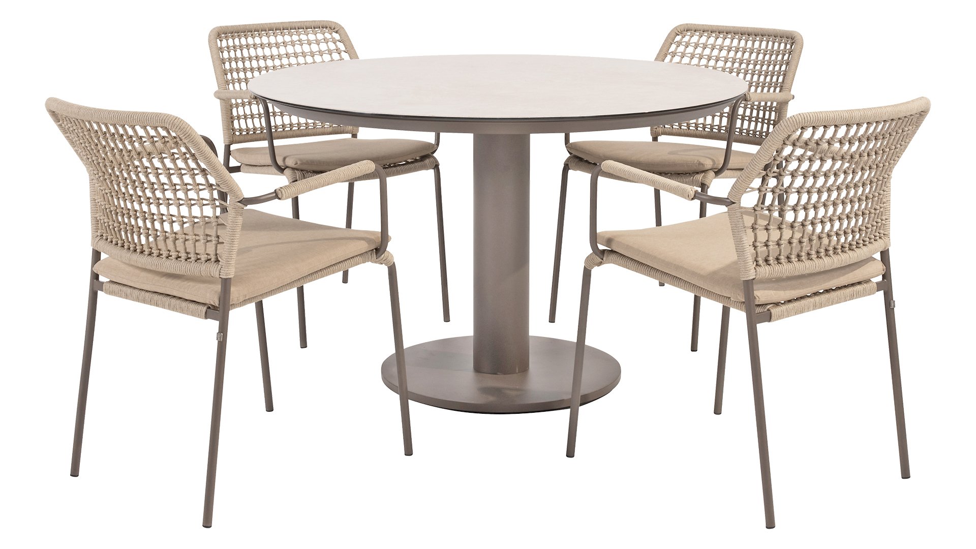 Maak kennis met de Taste Sarah, de ronde tafel die elegantie en functionaliteit moeiteloos combineert. Deze prachtige tafel is een echte blikvanger in iedere tuin of eetruimte. Dankzij het ronde design geniet je van een gezellige, uitnodigende sfeer waarbij iedereen aan tafel met elkaar in contact blijft. Het blad van hoogwaardig printed keramiek zorgt niet alleen voor een luxe uitstraling, maar is ook buitengewoon sterk, krasvast en onderhoudsvriendelijk. De centrale poot biedt maximale beenruimte en geeft de tafel een moderne, luchtige look. De Taste by 4 Seasons Outdoor Sarah is in twee varianten en twee kleuren verkrijgbaar. De tafel is verkrijgbaar in twee maten: 120x75cm (dining) en 130x69cm (low dining), in de kleuren Latte en Terre. Bekijk ze hieronder: