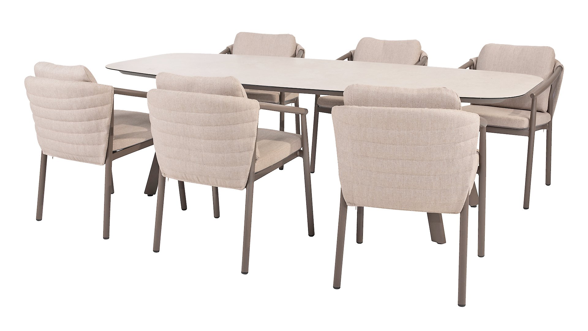 Op zoek naar een onderhoudsarme tafel met een moderne uitstraling? Kijk dan eens naar de Taste by 4 Seasons Outdoor Manolo 240cm, verkrijgbaar in de kleuren Antraciet, Latte én Terre. Door de vorm van het tafelblad en de positie van de aluminium tafelpoten is deze tafel heel erg praktisch. Door de vorm ontstaat er genoeg ruimte aan alle zijdes van de tafel. De tafel onderscheidt zich door het Deens ovale tafelblad, gemaakt van glass printed keramiek waardoor de tafel het hele jaar door buiten kan blijven staan. Geen plek voor een 240cm tafel? Dan kunnen de Taste 4 Seasons Manolo 75cm of 180cm alternatieven zijn, beide afmetingen zijn verkrijgbaar in Latte, Antraciet en Terre.