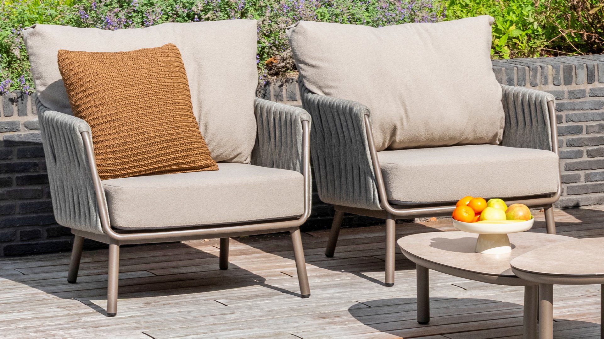 - Luxe uitstraling: Het dikke grijs-rope draad, samen met de terrakleur, zorgt voor een stijlvolle uitstraling. De kers op de taart zijn de kussens met boucléstoffering!