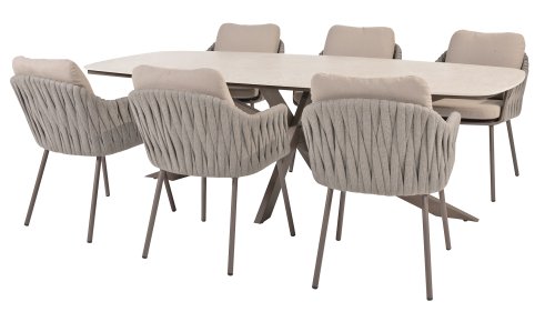 Elegant en modern: de Cannes tuinset van Taste by 4 Seasons Outdoor brengt een verfijnde rust in elke buitenruimte. Het subtiel terrekleurige, gepoedercoate aluminium frame vormt een prachtig contrast met het zachtgrijze rope patroon, dat met vakmanschap rondom de stoel is gevlochten. De royale Olefin kussens in lichtgrijs bieden niet alleen ultiem zitcomfort, maar zijn ook bestand tegen weer en wind. Deze set is ontworpen voor lange avonden tafelen, ontspannen gesprekken en sfeervolle momenten in de buitenlucht. Met zijn hoogwaardige materialen en luxe uitstraling nodigt de Cannes u uit om seizoen na seizoen te genieten. Naast de dining variant is de Taste 4SO Cannes ook als low-dining, loungeset en high dining verkrijgbaar, zodat de gehele tuin in dezelfde elegante stijl kan worden ingericht.