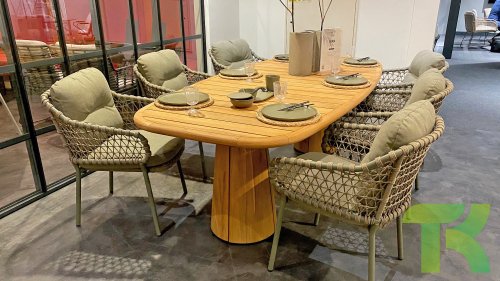 De ronde poten zorgen voor stabiliteit en dragen bij aan het strakke design van de tafel. De natuurlijke tinten en de prachtige nerf van het teakhout zorgen ervoor dat elke tafel uniek is, met een warme, uitnodigende uitstraling. Deze tafel is perfect voor sociale bijeenkomsten en dagelijkse maaltijden. Een echte blikvanger die functionaliteit en esthetiek combineert. Ook verkrijgbaar in de volgende maten: