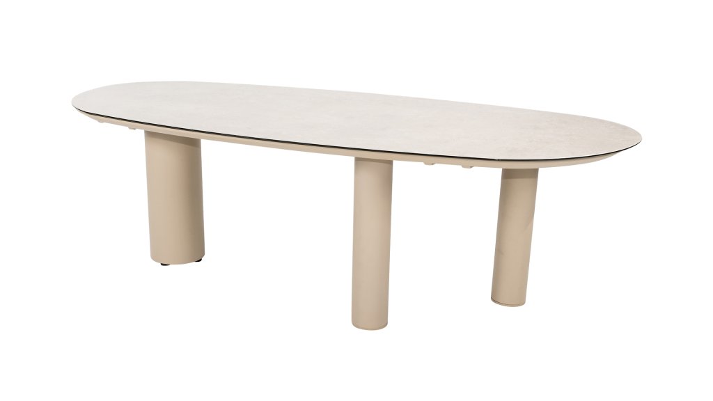 Het opvallende mango shaped tafelblad geeft de Denia tafel een speels organisch silhouet dat direct in het oog springt. Verkrijgbaar in twee kleuren - Latte en Terre - én twee afmetingen – 290x110x75 cm en 240x105x75 cm. Het tafelblad is vervaardigd uit keramiek op glas, een sterke en onderhoudsvriendelijke combinatie die bestand is tegen krassen, hitte en vlekken. De driepoots onderstelconstructie van gepoedercoat aluminium zorgt voor maximale stabiliteit én een moderne uitstraling. Bekijk hieronder alle varianten binnen de Taste Denia tafel serie: