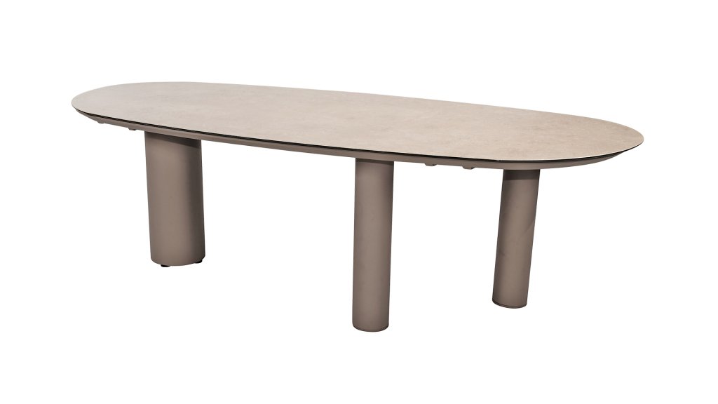 Het opvallende mango shaped tafelblad geeft de Denia tafel een speels organisch silhouet dat direct in het oog springt. Verkrijgbaar in twee kleuren - Latte en Terre - én twee afmetingen – 290x110x75 cm en 240x105x75 cm. Het tafelblad is vervaardigd uit keramiek op glas, een sterke en onderhoudsvriendelijke combinatie die bestand is tegen krassen, hitte en vlekken. De driepoots onderstelconstructie van gepoedercoat aluminium zorgt voor maximale stabiliteit én een moderne uitstraling. Bekijk hieronder alle varianten binnen de Taste Denia tafel serie: