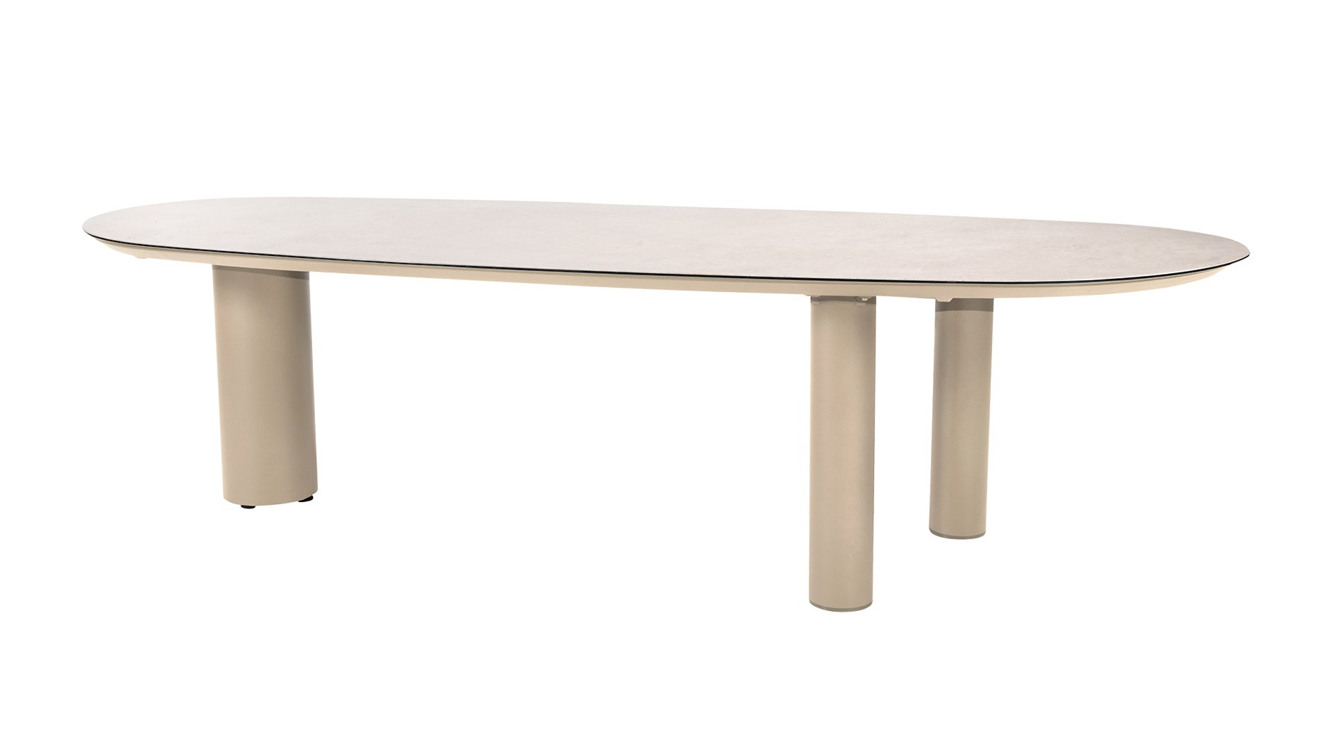 Het opvallende mango shaped tafelblad geeft de Denia tafel een speels organisch silhouet dat direct in het oog springt. Verkrijgbaar in twee kleuren - Latte en Terre - én twee afmetingen – 290x110x75 cm en 240x105x75 cm. Het tafelblad is vervaardigd uit keramiek op glas, een sterke en onderhoudsvriendelijke combinatie die bestand is tegen krassen, hitte en vlekken. De driepoots onderstelconstructie van gepoedercoat aluminium zorgt voor maximale stabiliteit én een moderne uitstraling. Bekijk hieronder alle varianten binnen de Taste Denia tafel serie: