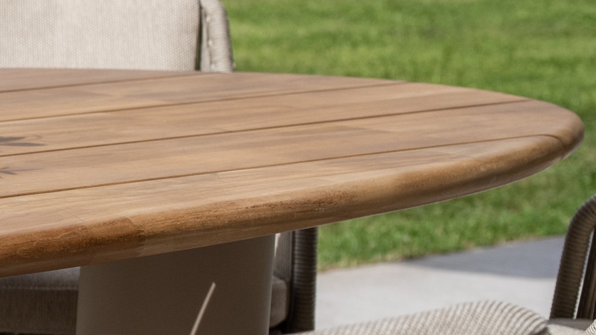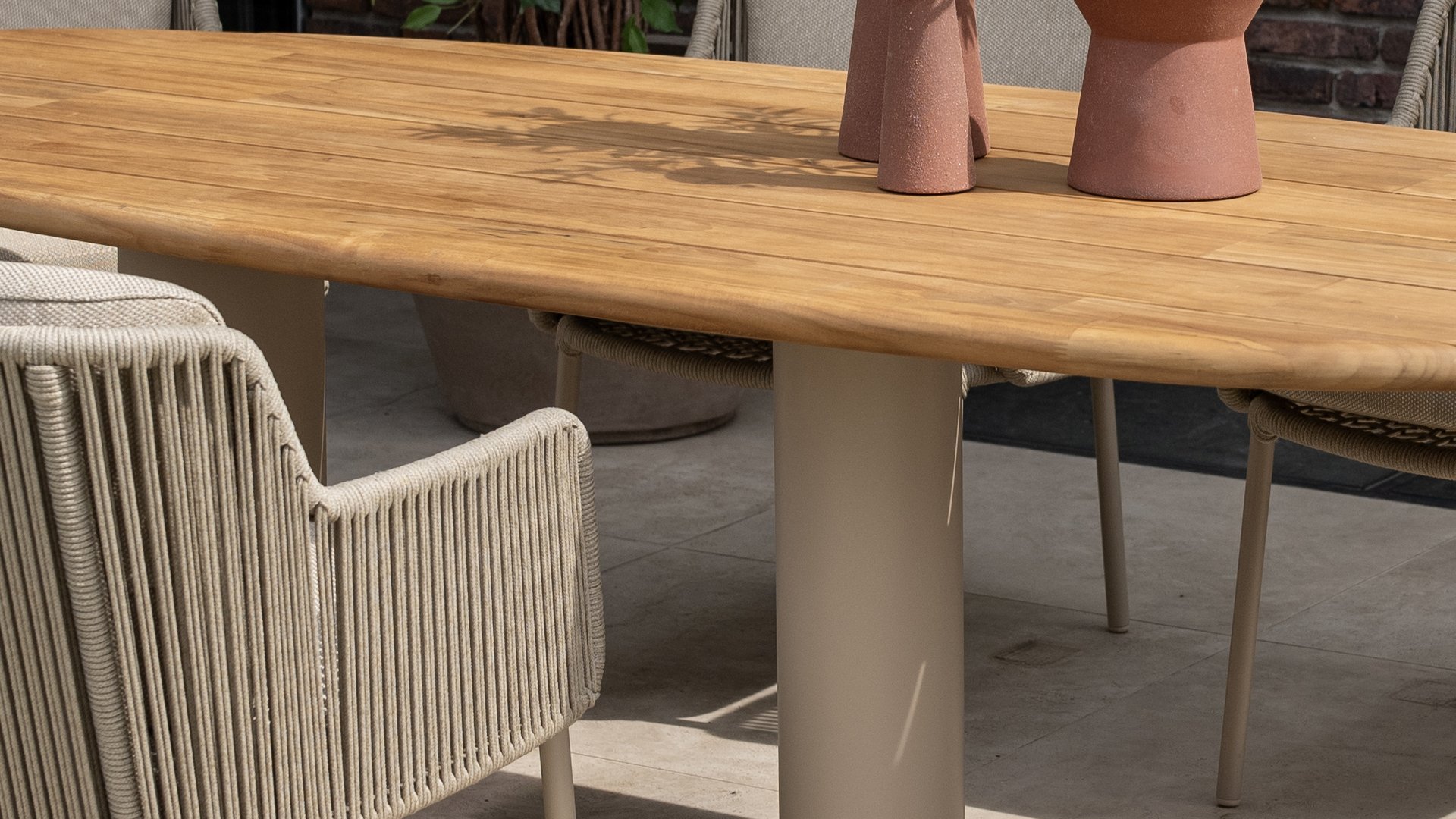 De Estate is verkrijgbaar met een keramieken- én teakhouten blad. En daar houdt het niet op, zo is hij ook in twee kleuren verkrijgbaar, waaronder: Latte & Amber. Ben je een liefhebber voor een onderhoudsvrije tafel? Dan is de keramieken variant een betere keuze. Houd je toch meer van een natuurlijke touch? Dan is het teakhouten blad meer iets voor jou. Het robuuste onderstel is gemaakt van gepoedercoat aluminium. Het driepoot-onderstel, bestaande uit drie recht naar beneden lopende kolommen, geeft de tafel een moderne en stabiele basis. Bekijk hieronder de tafels: