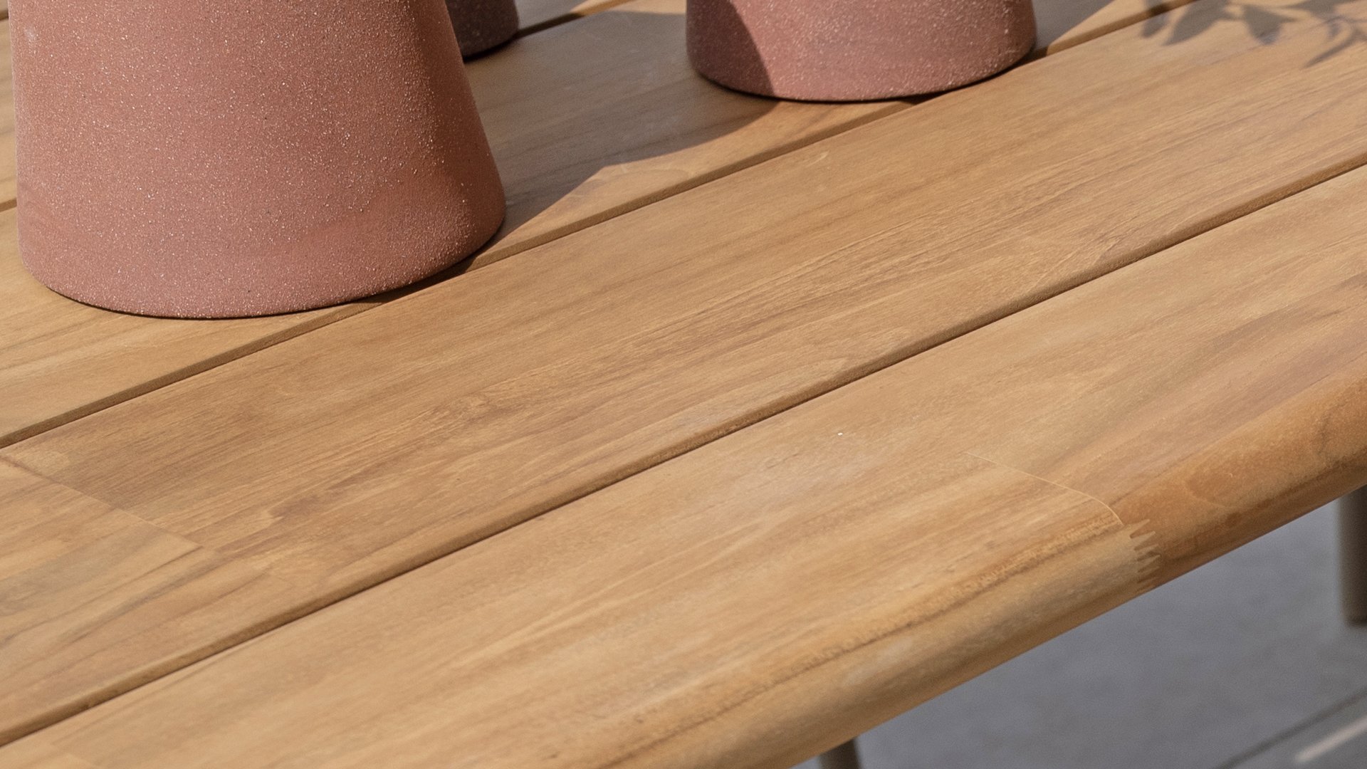 Teakhout is een natuurproduct en bijzonder geschikt voor buitengebruik. Het is bestand tegen ongedierte en schimmels en kan tegen zon, regen en sneeuw. Na verloop van tijd ontwikkelt het teakhout een zilvergrijze patina. Teakhout is een robuust materiaal en vergt weinig onderhoud. Als u de voorkeur geeft aan de originele kleur van het teakhout, kunt u eenvoudig voorkomen dat het hout vergrijst door regelmatig ons verzorgingsproduct te gebruiken. Teakhout kunt u ook reinigen met groene zeep. We geven garantie op alle productie en constructiefouten. De werking van teakhout is hier niet bij inbegrepen. Wanneer je kiest voor teakhout, verwachten we dat je deze eigenschappen waardeert. Haarscheurtjes die kunnen ontstaan, noesten in het teak en na verloop ruwe oppervlakken of onregelmatige verkleuringen zijn geen onderdeel van onze garantie. Deze eigenschappen geven het teakhout een eigen karakter en uitstraling zijn onderdeel van de natuurlijke eigenschappen. Wees voorzichtig met een bloempot of vaas op je teak tuintafel, hierdoor ontstaan er hardnekkige kringen of kleurverschillen. Imperfecties komen vaak voor, deze oneffenheden zijn kenmerkend voor dit product. Deze onregelmatigheden kunnen nooit aanleiding geven tot een claim, garantie of klacht. Dit is een teken van originaliteit!