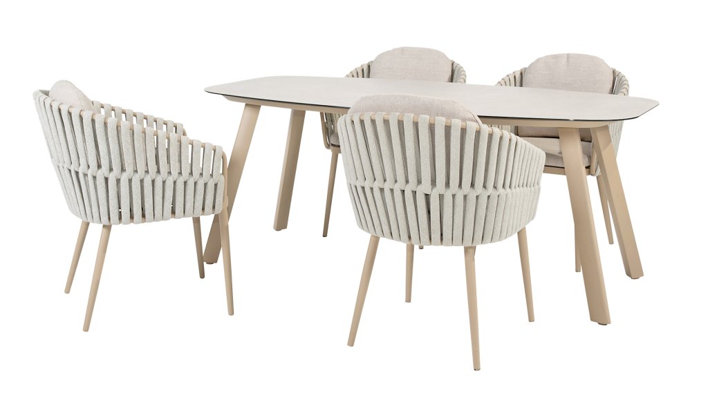Op zoek naar een onderhoudsarme tafel met een moderne uitstraling? Kijk dan eens naar de Taste by 4 Seasons Outdoor Manolo 180cm, verkrijgbaar in de kleuren Antraciet, Latte én Terre. Door de vorm van het tafelblad en de positie van de aluminium tafelpoten is deze tafel heel erg praktisch. Door de vorm ontstaat er genoeg ruimte aan alle zijdes van de tafel. De tafel onderscheidt zich door het Deens ovale tafelblad, gemaakt van glass printed keramiek waardoor de tafel het hele jaar door buiten kan blijven staan. De Manolo is ook nog verkrijgbaar in de maten: 75x75x75cm en 240x103x75cm in drie kleuren.