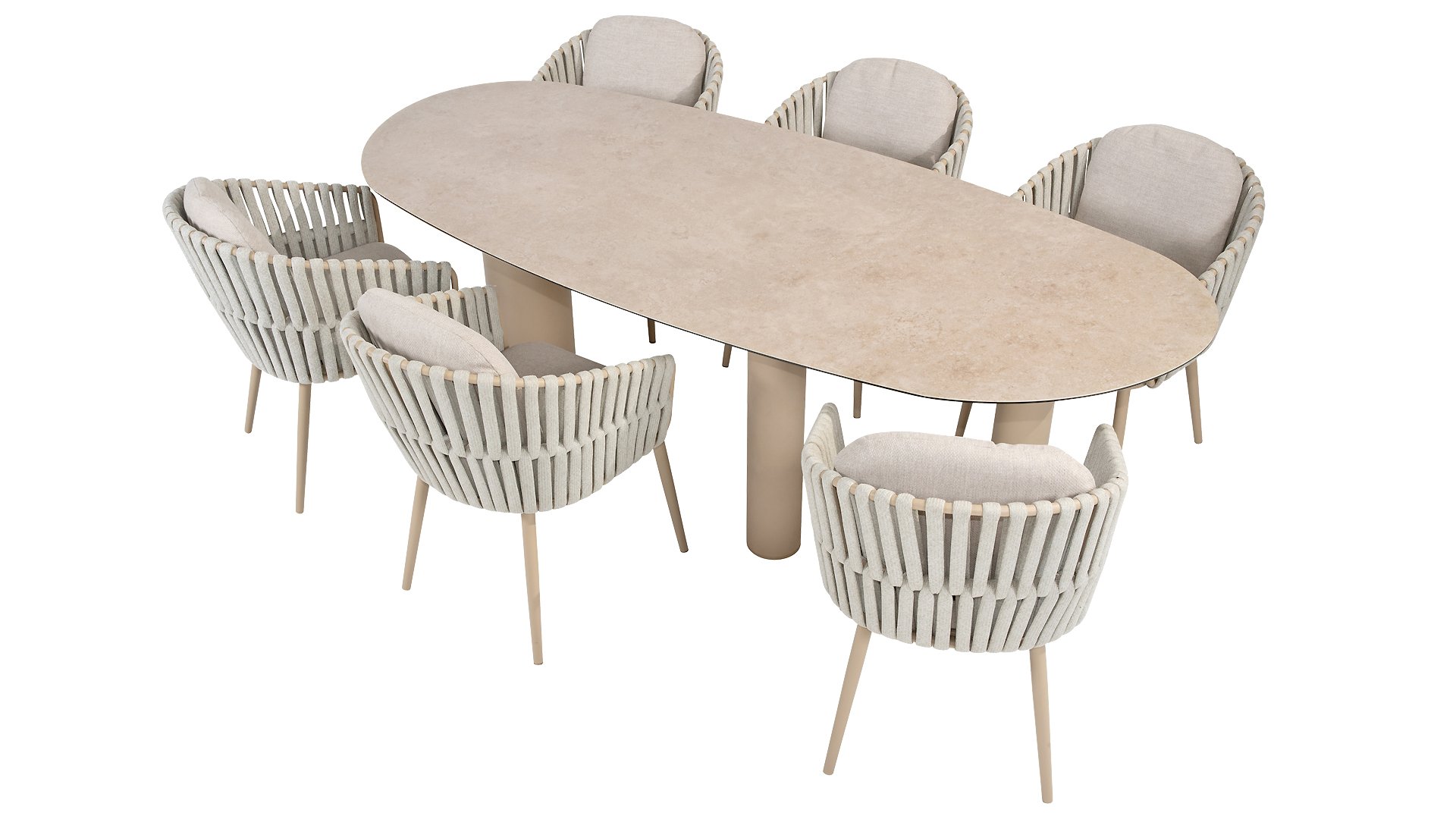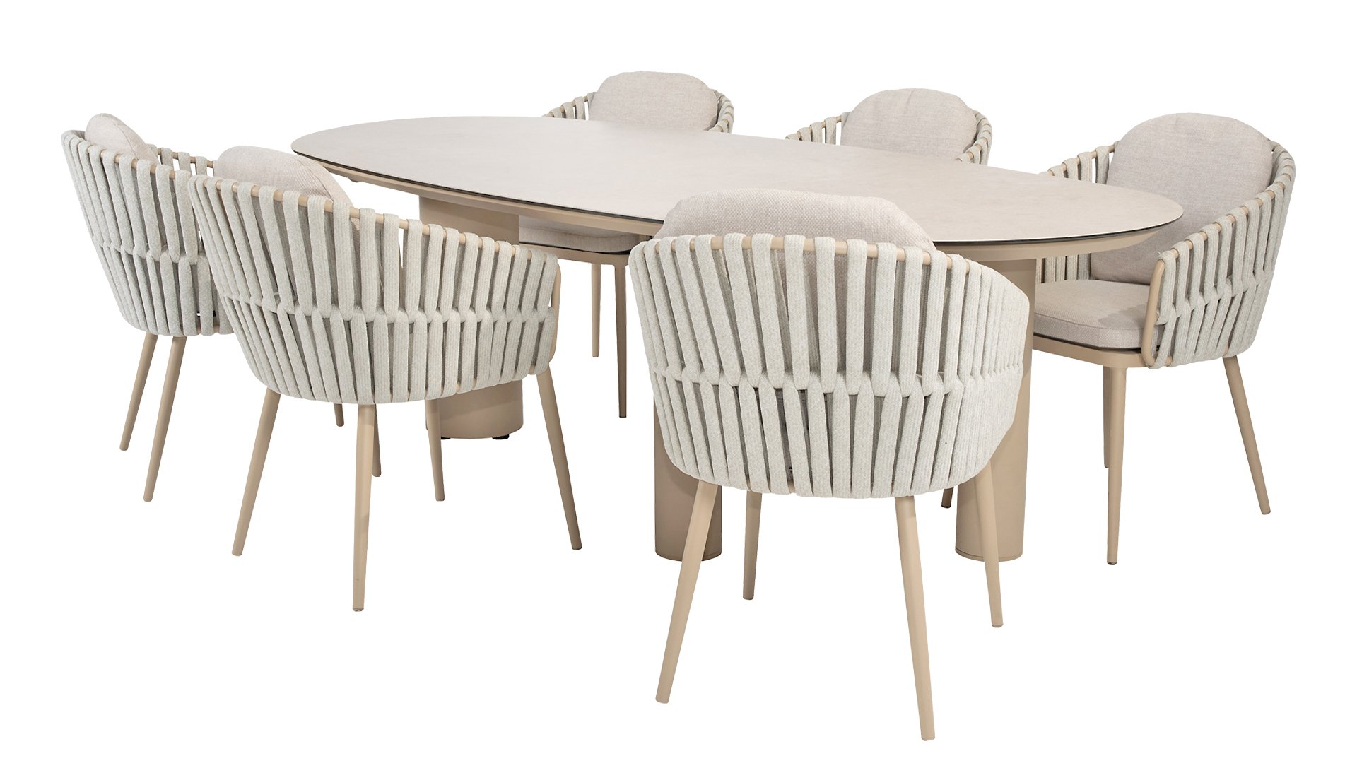 Maak kennis met de Taste by 4 Seasons Outdoor Denia tafelserie – stijlvol dineren in elk seizoen. Ontdek de perfecte combinatie van design, duurzaamheid en verfijning met de Denia tafelserie. Deze exclusieve serie tilt buiten tafelen naar een hoger niveau, met een uniek ontwerp en hoogwaardige materialen die zowel functioneel als elegant zijn. Het opvallende mango shaped tafelblad geeft de Denia tafel een speels organisch silhouet dat direct in het oog springt. Verkrijgbaar in twee kleuren - Latte en Terre - én twee afmetingen – 290x110x75 cm en 240x105x75 cm. Het tafelblad is vervaardigd uit keramiek op glas, een sterke en onderhoudsvriendelijke combinatie die bestand is tegen krassen, hitte en vlekken. De driepoots onderstelconstructie van gepoedercoat aluminium zorgt voor maximale stabiliteit én een moderne uitstraling. Bekijk hieronder alle varianten binnen de Taste Denia tafel serie: