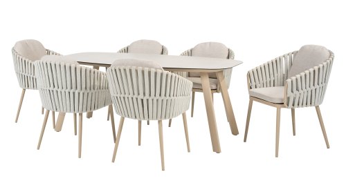 Passie voor Eva Ontworpen met oog voor detail. De dikke, zachte rope banden volgen de mooie organische vorm van het frame. Tel daarbij op de heerlijke comfortabele kussens en je snapt waarom wij lyrisch zijn over de Taste by 4 Seasons Outdoor Eva lounge- én diningset. De Taste 4SO Eva dining stoel heeft een moderne uitstraling. De stoel wordt geleverd inclusief zachte kussens en heeft een eigentijds, aluminium frame met matchende, latte rope bekleding. Het dikke rope combineert mooi met het latte frame en zorgt, samen met de kussens, voor een comfortabel zitcomfort. Een kleur die zich het beste laat beschrijven als smaakvol beige. Hier zijn enkele kenmerken die deze dining stoel tot een favoriet maken: 5 jaar garantie, makkelijk verplaatsbaar, moderne look, natuurlijke uitstraling, weerbestendig, inclusief kussen(s), onderhoudsarm.