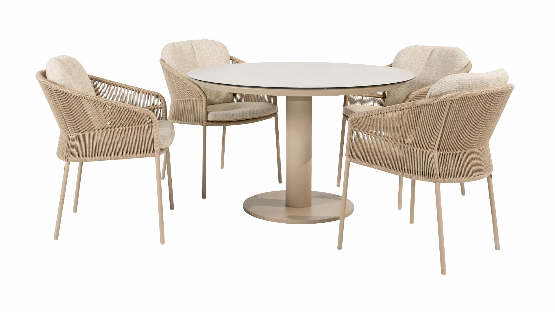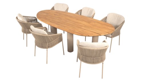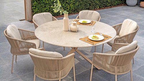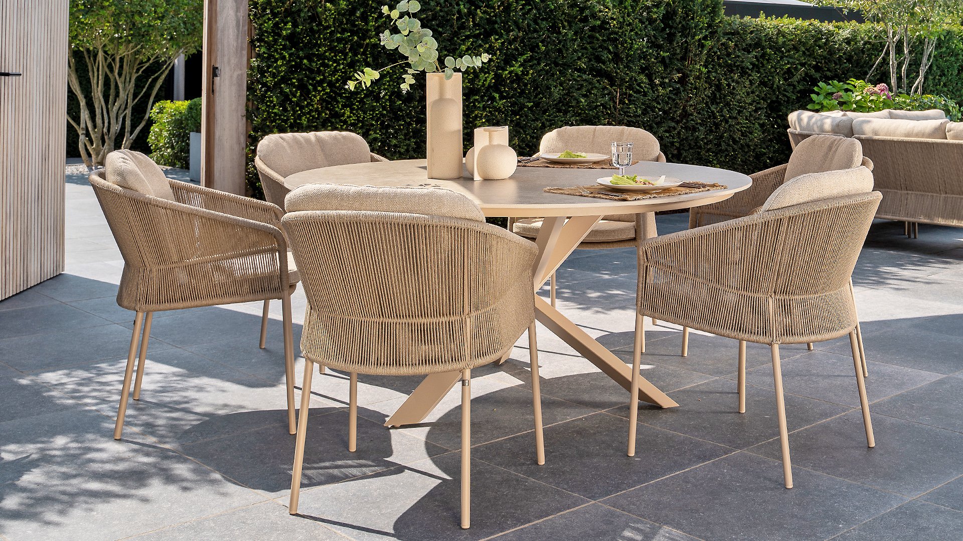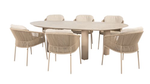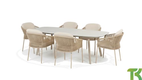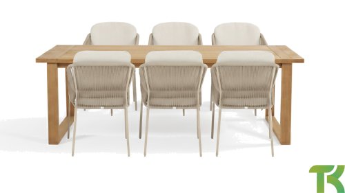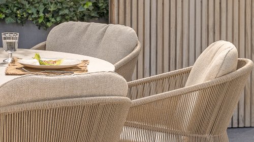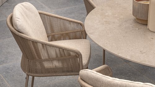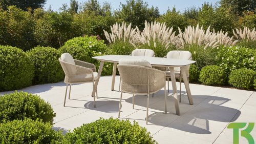 Geïnspireerd door de tijdloze charme van Italië. Florence wordt gekenmerkt door het strak geweven touwpatroon en de verfijnde splitsing tussen rugleuning en zitting, wat zorgt voor een modern en elegant effect. De comfortabele kussens bieden uitstekend zitcomfort, waardoor deze eetkamerset perfect is voor lange, ontspannende momenten buitenshuis. Verkrijgbaar in twee elegante kleuren: Taste 4SO Florence Terre Dining – een warme, aardse tint die perfect blendt met natuurlijke tuinelementen. Taste Florence Latte Dining – een lichte, elegante kleur die zorgt voor een frisse, zomerse look.