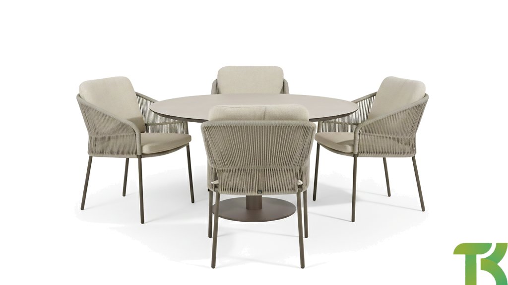 Geïnspireerd door de tijdloze charme van Italië. Florence wordt gekenmerkt door het strak geweven touwpatroon en de verfijnde splitsing tussen rugleuning en zitting, wat zorgt voor een modern en elegant effect. De comfortabele kussens bieden uitstekend zitcomfort, waardoor deze eetkamerset perfect is voor lange, ontspannende momenten buitenshuis.