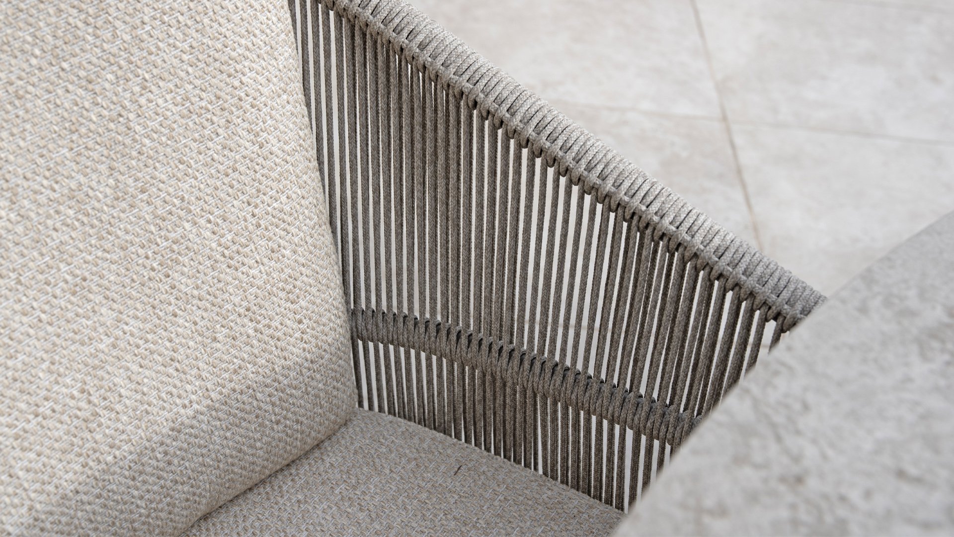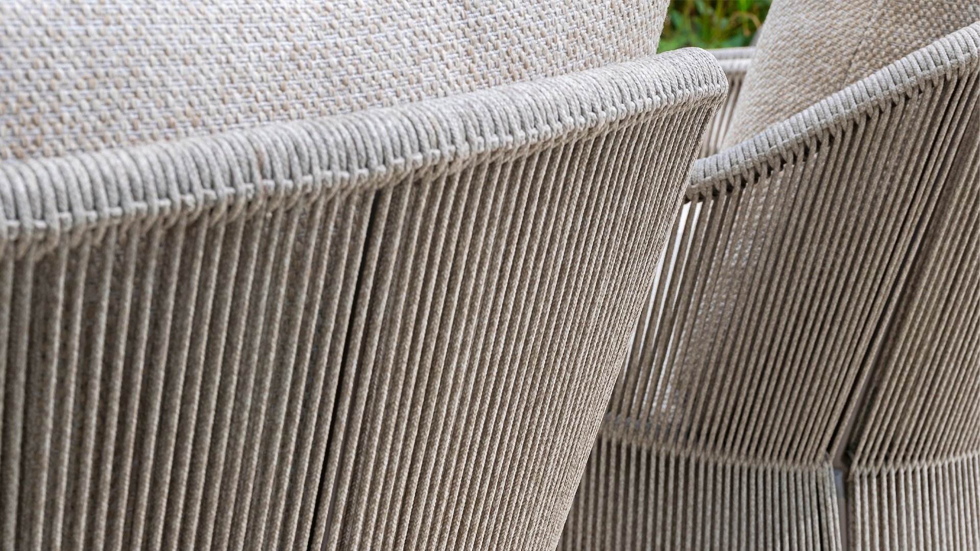Geïnspireerd door de tijdloze charme van Italië. Florence wordt gekenmerkt door het strak geweven touwpatroon en de verfijnde splitsing tussen rugleuning en zitting, wat zorgt voor een modern en elegant effect. De comfortabele kussens bieden uitstekend zitcomfort, waardoor deze eetkamerset perfect is voor lange, ontspannende momenten buitenshuis.