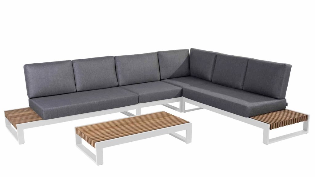 Het frame is gemaakt van gepoedercoat aluminium, in combinatie met hoogwaardig, teakhouten panelen aan de zijkant. De smalle latten van het teakhout vallen direct op. Door de open zijkanten met teakhouten blad heeft u uw drankje altijd bij de hand! De kussens in de Taste 4Seasons Kioto loungeset zijn zeer comfortabel en hebben een vuil- en waterafstotende coating, waardoor ze bestand zijn tegen een regenbui.