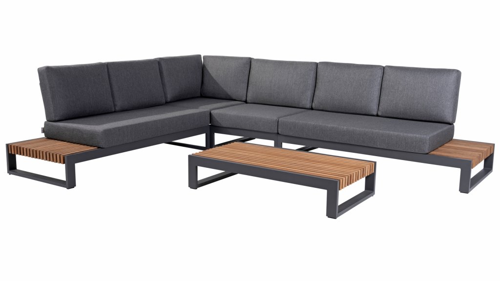 Het frame is gemaakt van gepoedercoat aluminium, in combinatie met hoogwaardig, teakhouten panelen aan de zijkant. De smalle latten van het teakhout vallen direct op. Door de open zijkanten met teakhouten blad heeft u uw drankje altijd bij de hand! De kussens in de Taste 4Seasons Kioto loungeset zijn zeer comfortabel en hebben een vuil- en waterafstotende coating, waardoor ze bestand zijn tegen een regenbui.