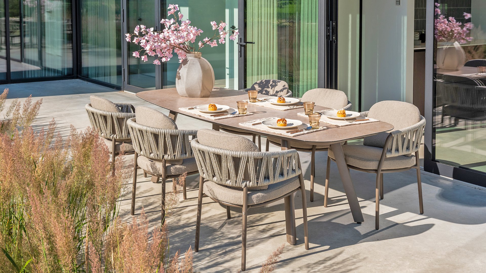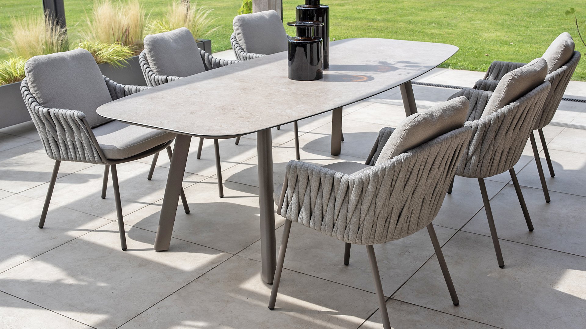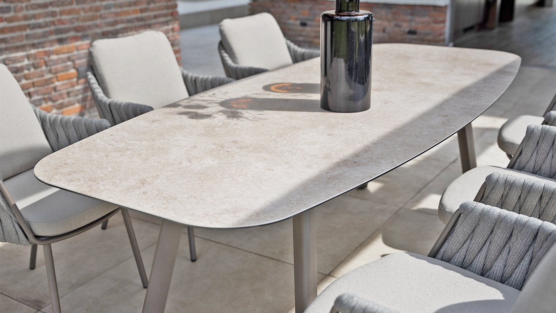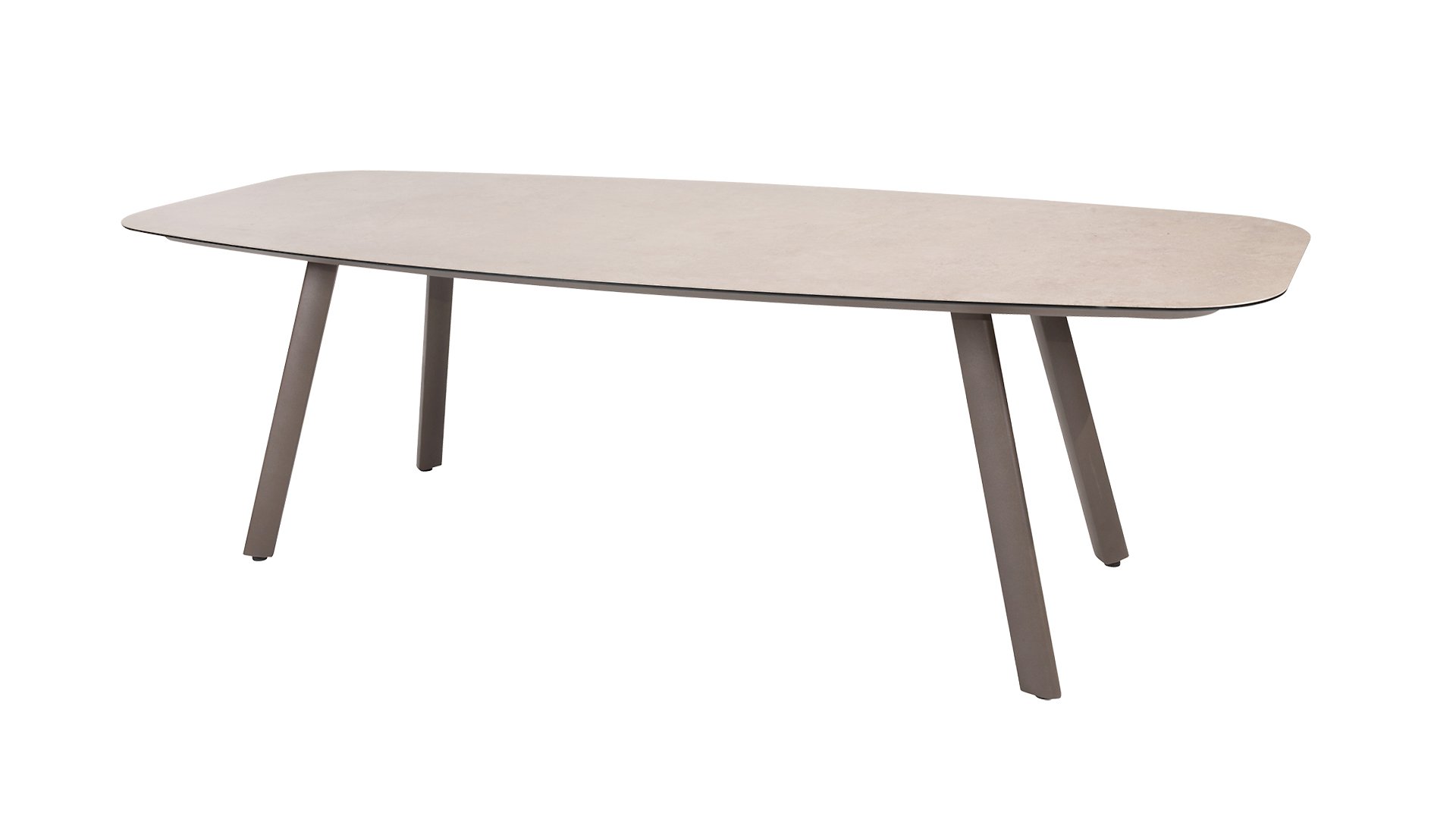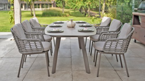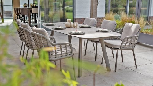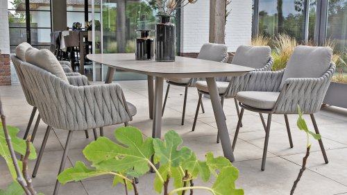 Op zoek naar een onderhoudsarme tafel met een moderne uitstraling? Kijk dan eens naar de Taste by 4 Seasons Outdoor Manolo 240cm, verkrijgbaar in de kleuren Antraciet, Latte én Terre. Door de vorm van het tafelblad en de positie van de aluminium tafelpoten is deze tafel heel erg praktisch. Door de vorm ontstaat er genoeg ruimte aan alle zijdes van de tafel. De tafel onderscheidt zich door het Deens ovale tafelblad, gemaakt van glass printed keramiek waardoor de tafel het hele jaar door buiten kan blijven staan. Geen plek voor een 240cm tafel? Dan kunnen de Taste 4 Seasons Manolo 75cm of 180cm alternatieven zijn, beide afmetingen zijn verkrijgbaar in Latte, Antraciet en Terre.