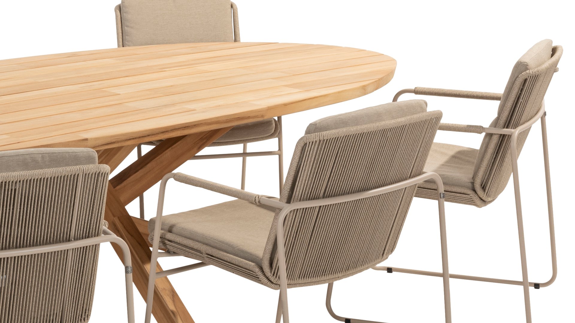 De Taste by 4Seasons Prado Ellips kan gerust een kunstwerk genoemd worden. Kijk eens hoe kunstig dat potenstel in elkaar steekt. Het dikke teakhouten blad heeft een schuine kant en geeft de tafel iets luchtigs. Te combineren met onze gehele collectie tuinstoelen. De Prado Ellips is ook verkrijgbaar met antraciete aluminium poten.