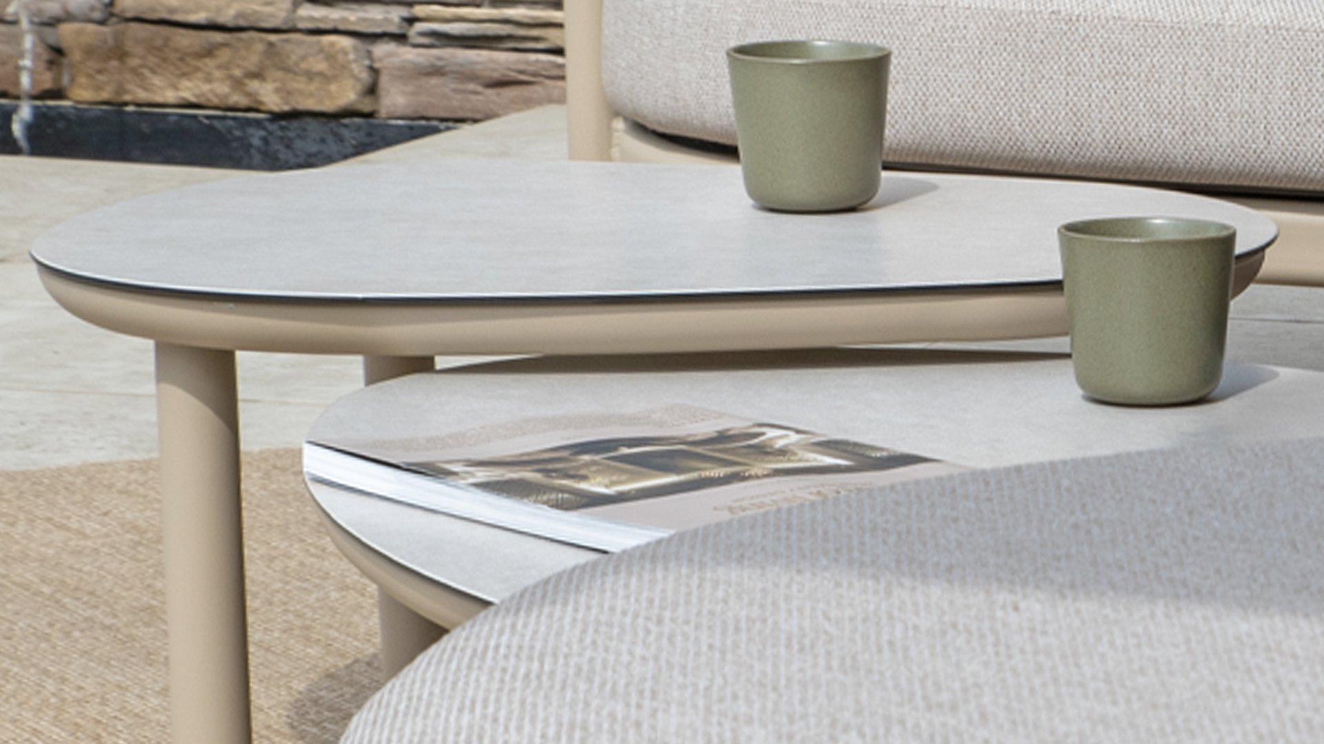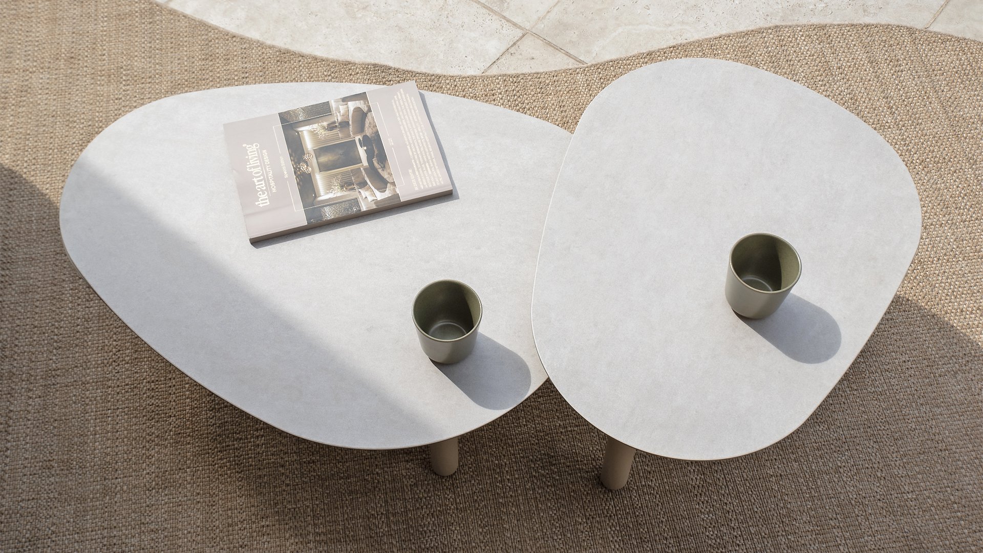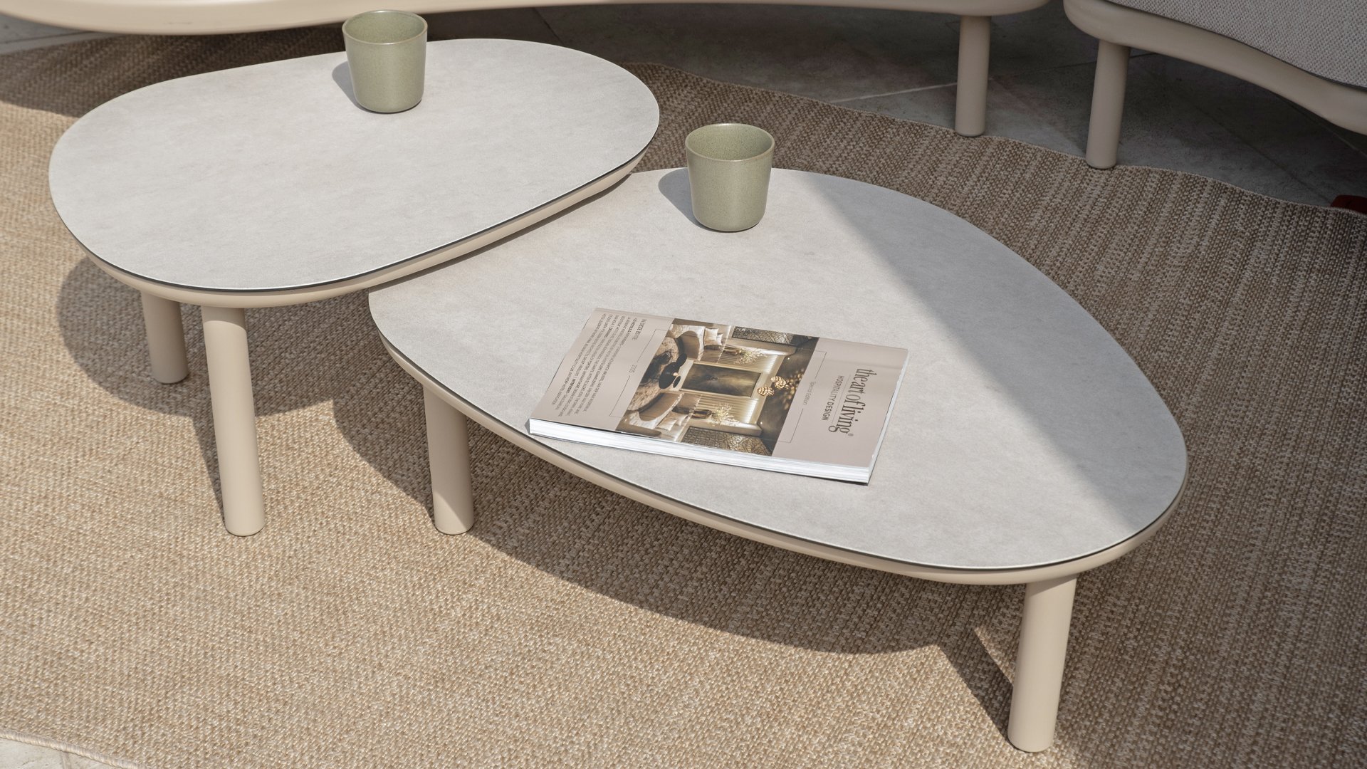 De bladen zijn vervaardigd uit printed keramiek op glas, wat zorgt voor een luxueuze uitstraling en een duurzaam, onderhoudsvriendelijk oppervlak. Het gepoedercoate aluminium onderstel biedt een stevige basis met een moderne, luchtige look. De set bestaat uit twee formaten – Ø65xH32cm en Ø80xH27cm – die perfect in elkaar passen of afzonderlijk kunnen worden geplaatst voor een dynamisch geheel.