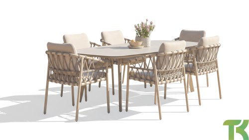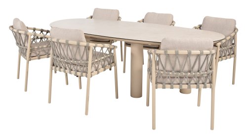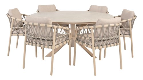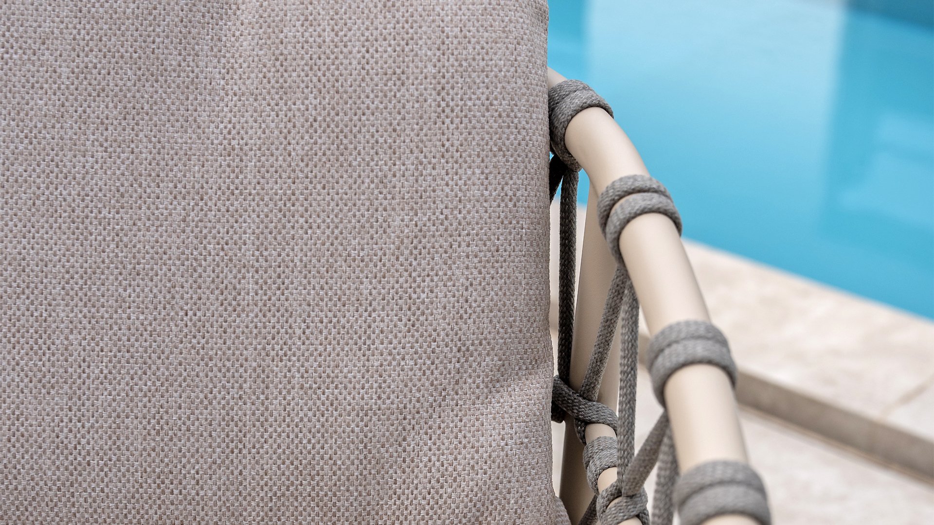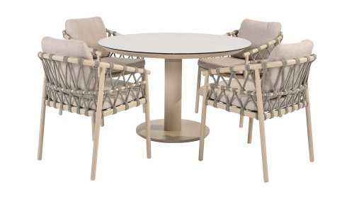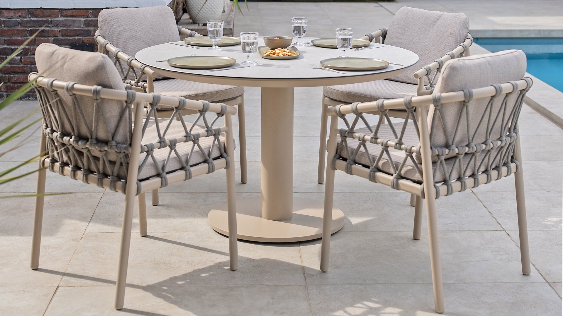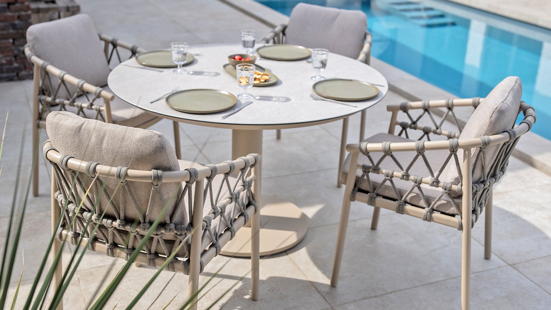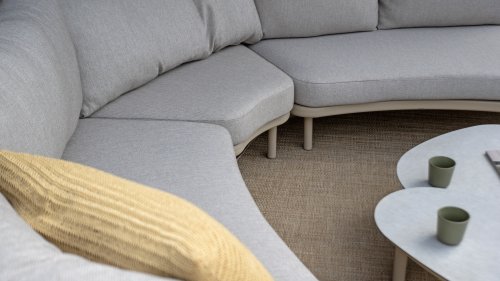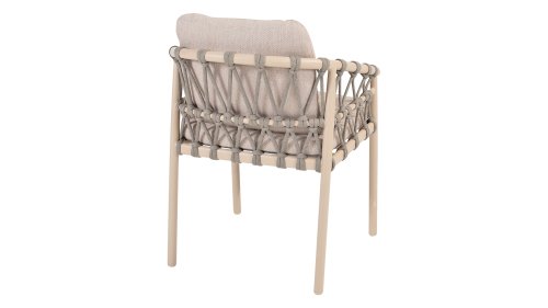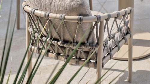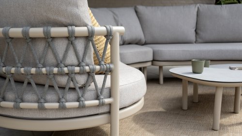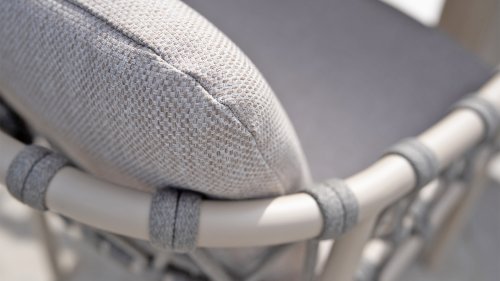 Wat de Piacenza uniek maakt, is de prachtige, zachte kleurstelling. Het frame van gepoedercoat aluminium is uitgevoerd in de kleur Latte. Deze warme, zandachtige tint geeft een veel zachtere en natuurlijkere uitstraling dan het standaard wit of antraciet. Het frame wordt gecombineerd met verfijnd, grijskleurig Rope-draad. Dit touwwerk is op een luchtige manier gevlochten, waardoor de stoel ruimtelijk oogt en een speels karakter krijgt. De comfortabele zitting wordt compleet gemaakt door lichtgrijze kussens van Olefin. Deze stof voelt zacht aan als binnenstof, maar is bestand tegen weer, wind en UV-straling.