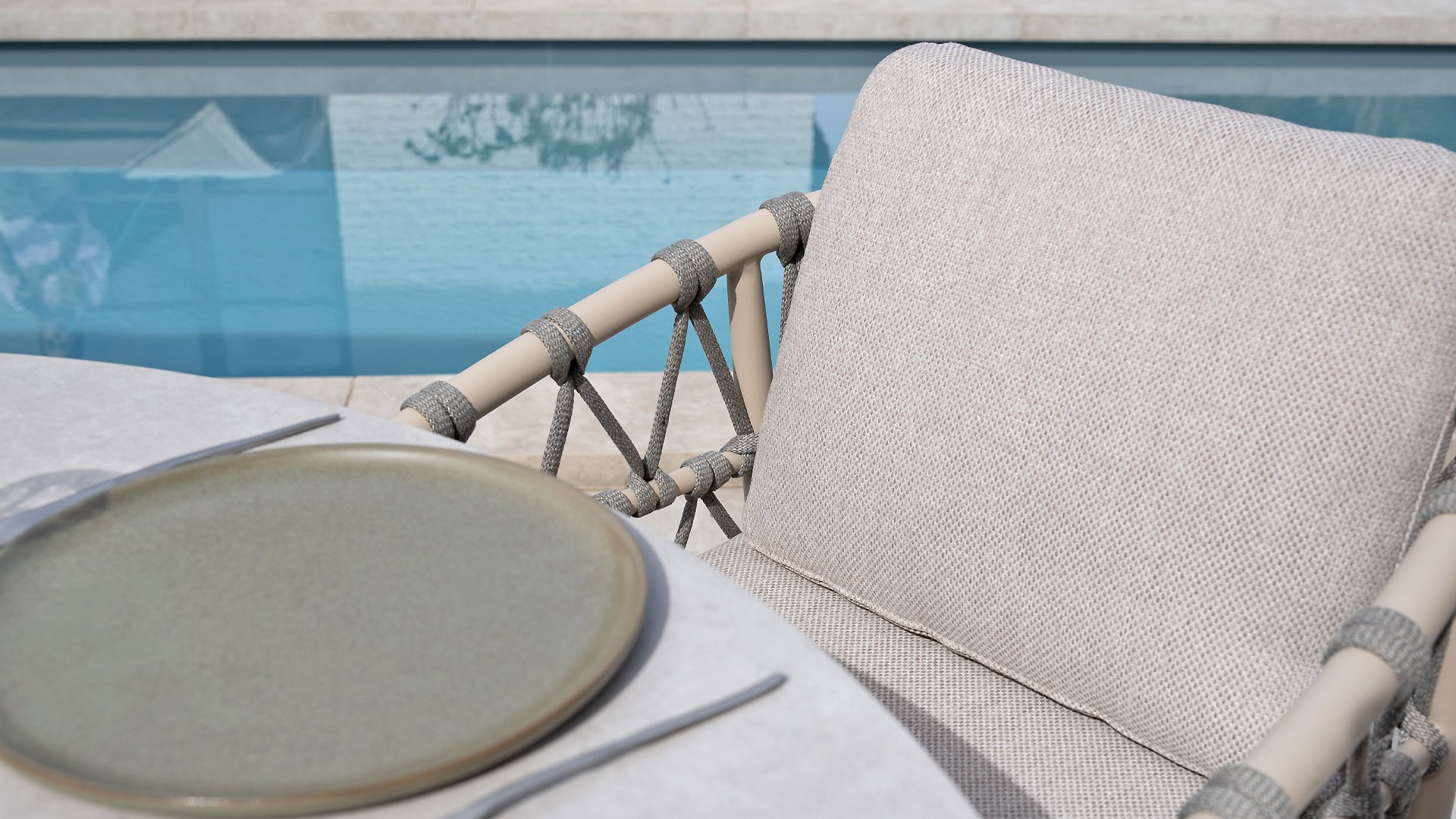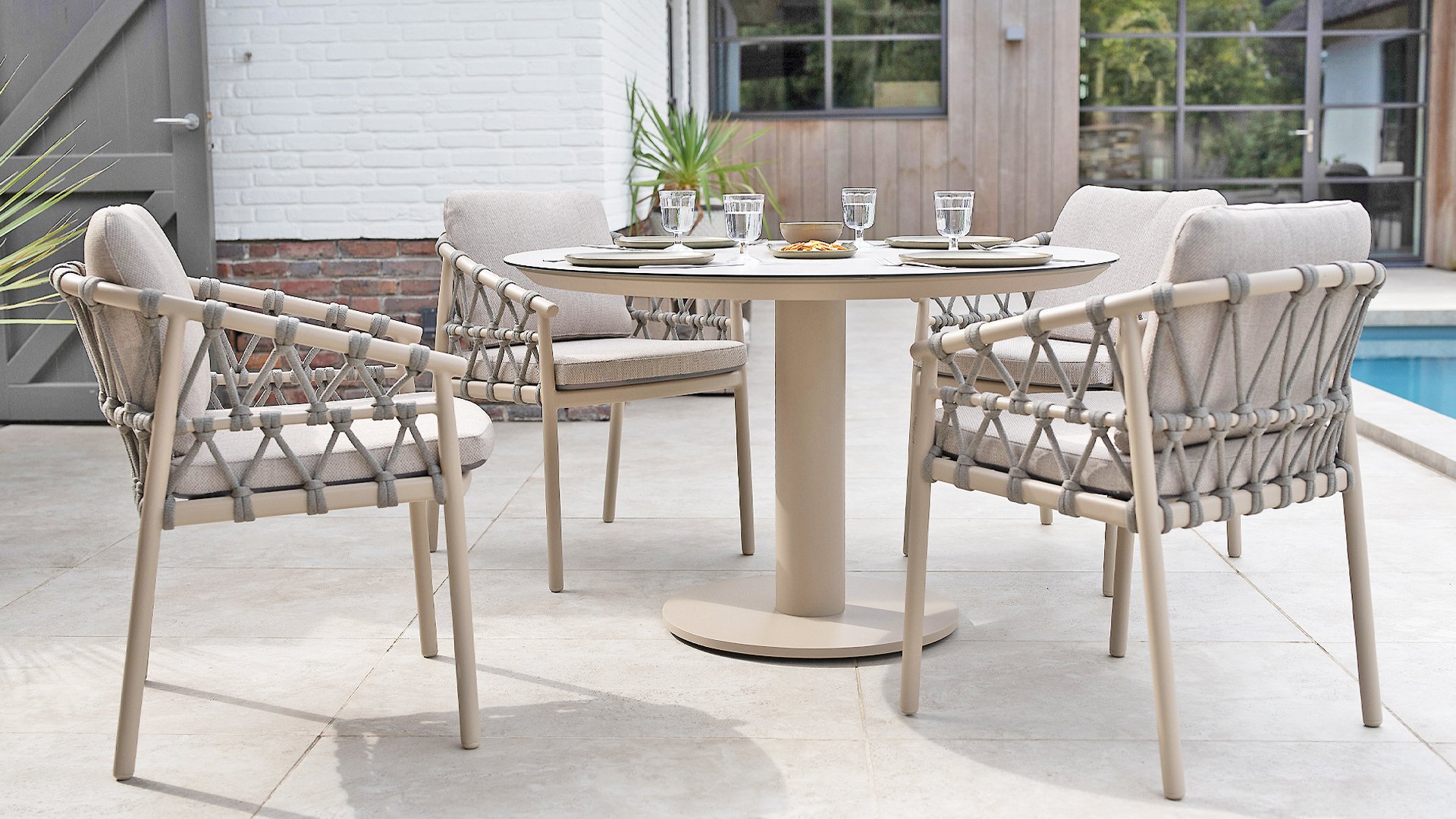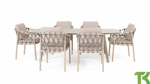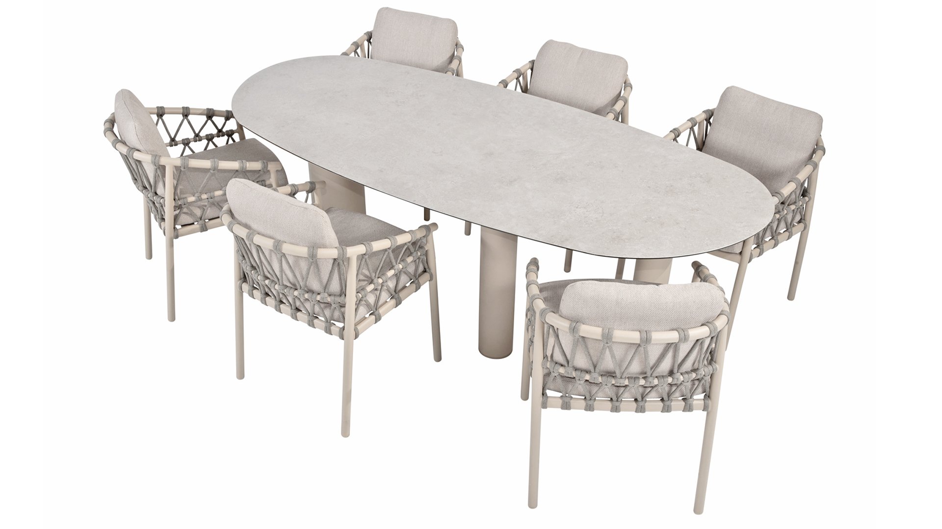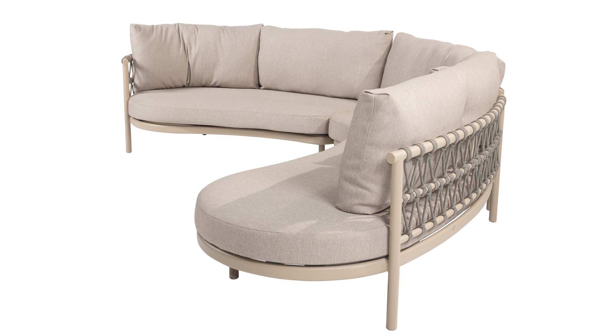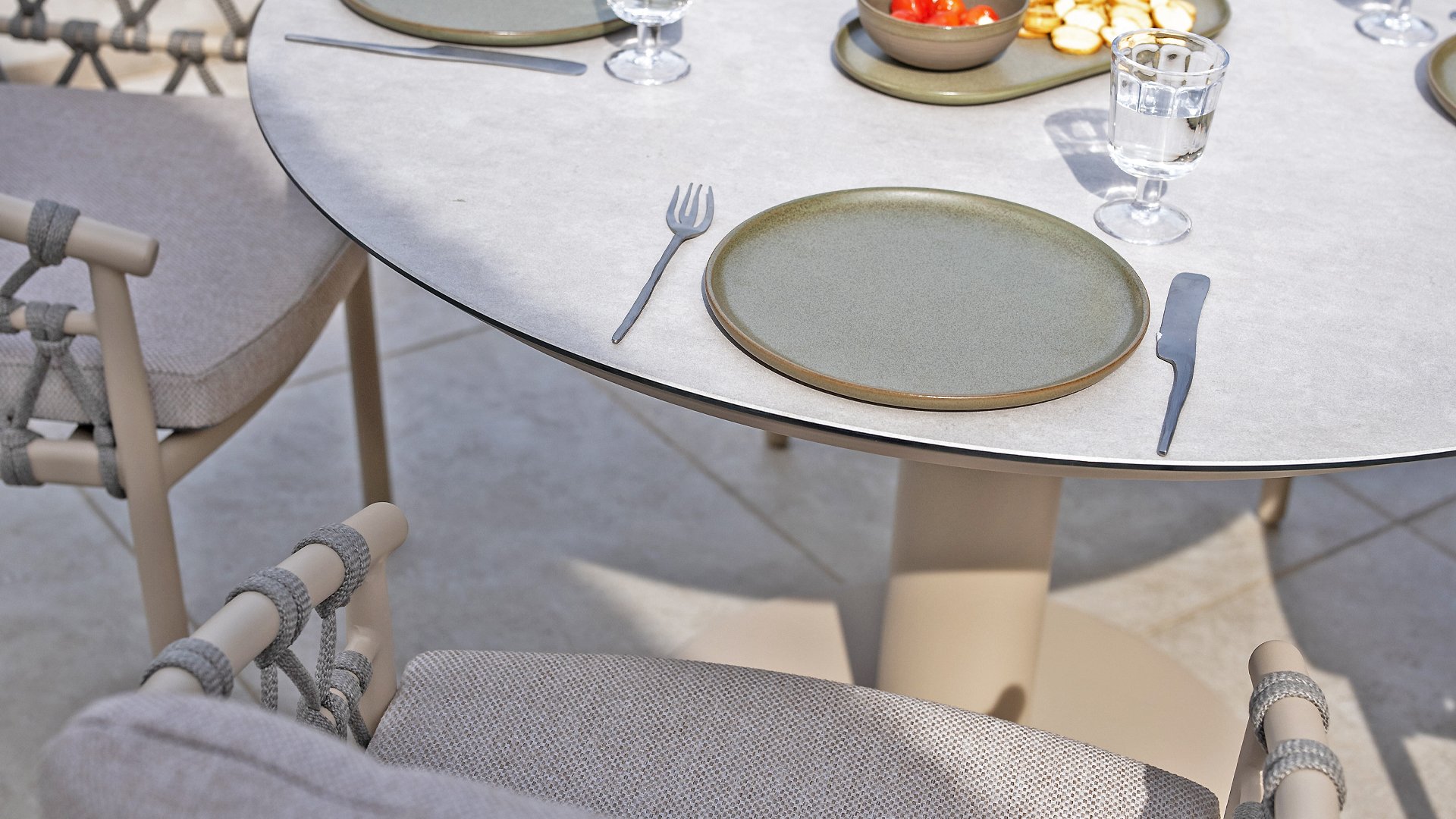 Wat de Piacenza uniek maakt, is de prachtige, zachte kleurstelling. Het frame van gepoedercoat aluminium is uitgevoerd in de kleur Latte. Deze warme, zandachtige tint geeft een veel zachtere en natuurlijkere uitstraling dan het standaard wit of antraciet. Het frame wordt gecombineerd met verfijnd, grijskleurig Rope-draad. Dit touwwerk is op een luchtige manier gevlochten, waardoor de stoel ruimtelijk oogt en een speels karakter krijgt. De comfortabele zitting wordt compleet gemaakt door lichtgrijze kussens van Olefin. Deze stof voelt zacht aan als binnenstof, maar is bestand tegen weer, wind en UV-straling.