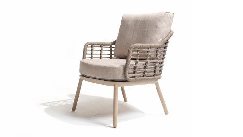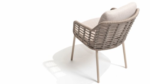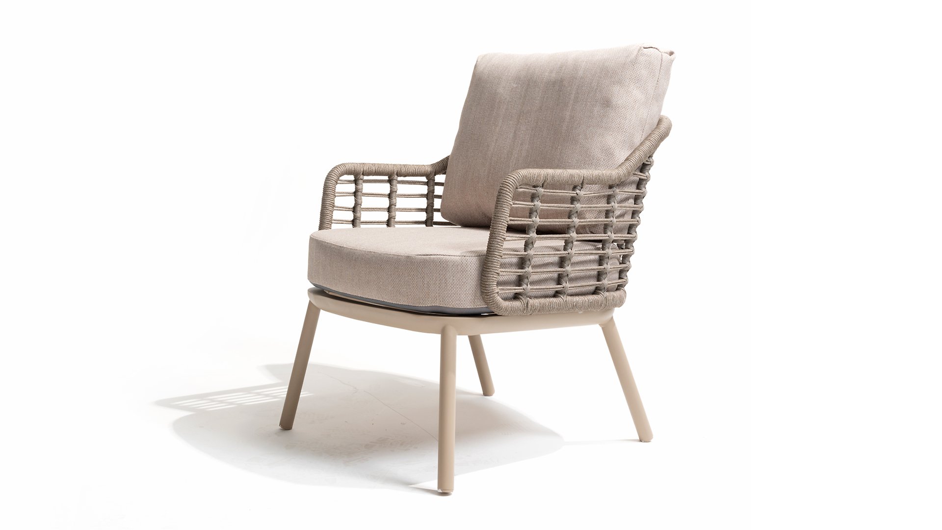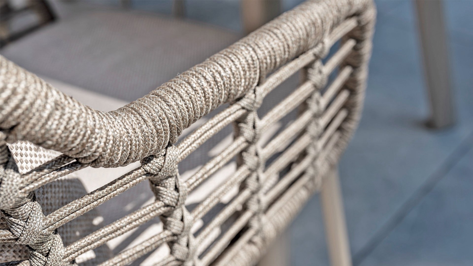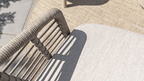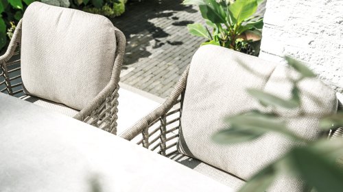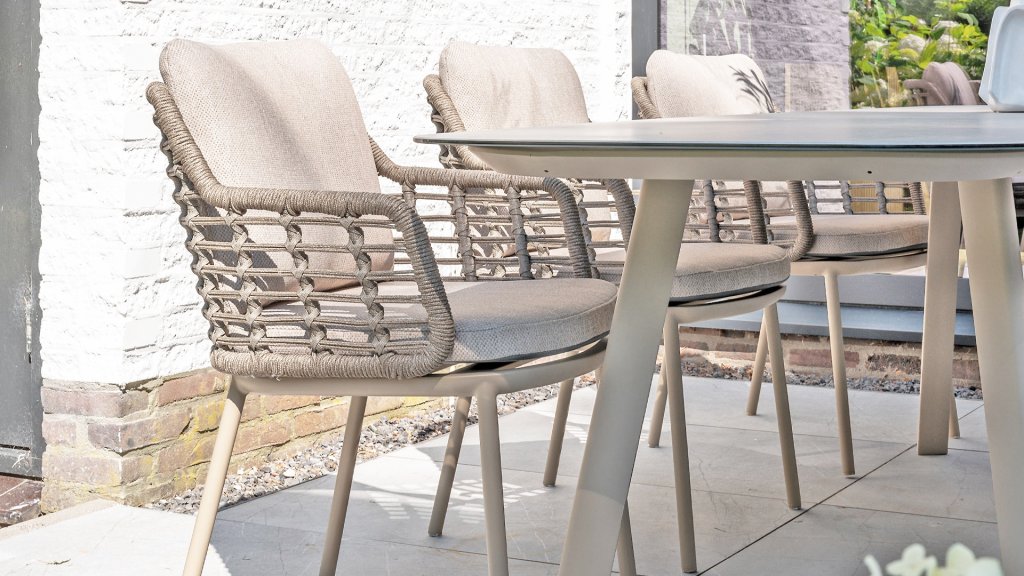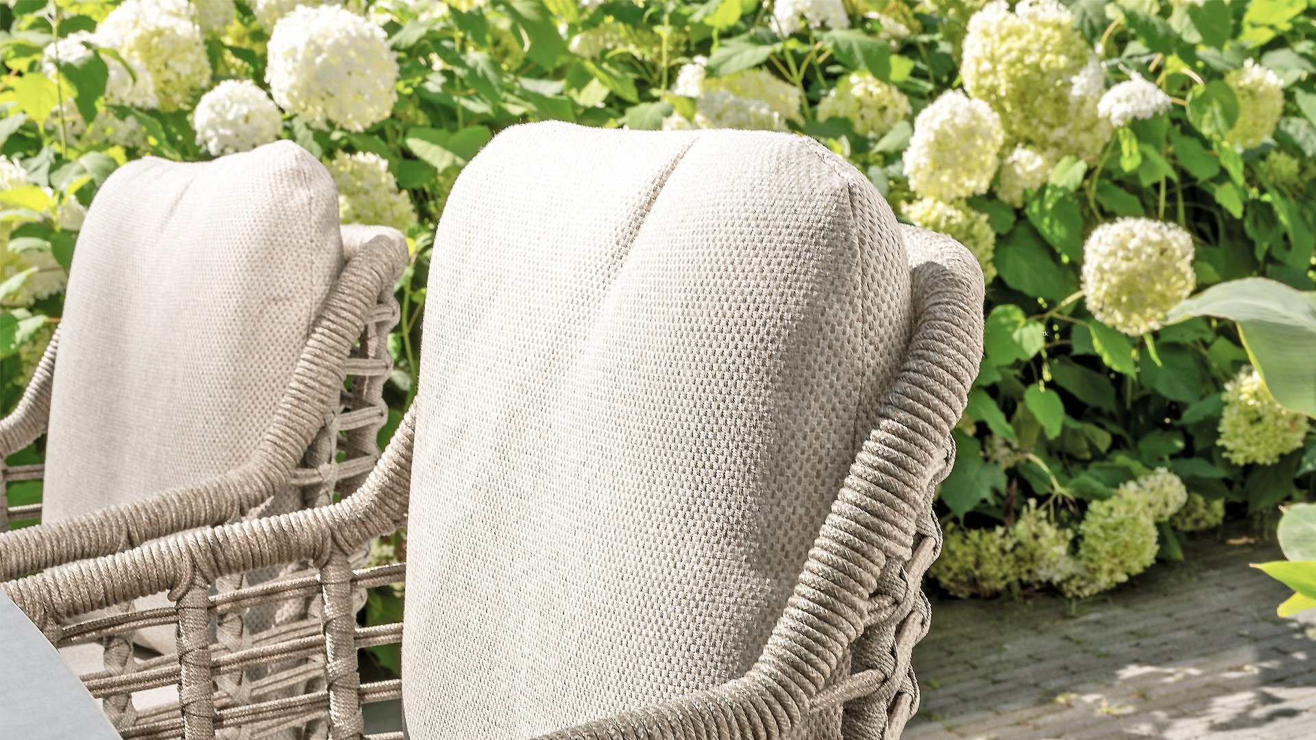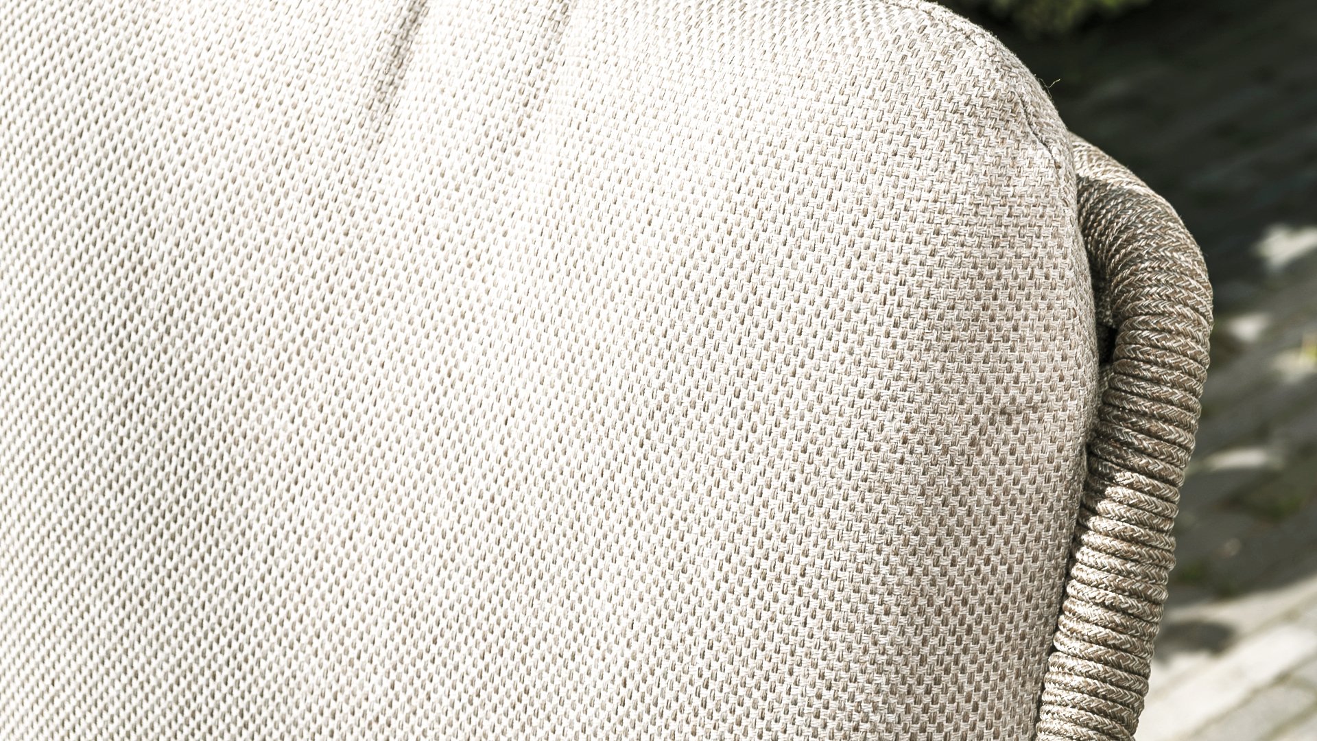 De kracht van de Puglia-serie zit in de slimme mix van materialen. Het frame is gemaakt van gepoedercoat aluminium; lichtgewicht en roestvrij. De rug- en armleuningen zijn vakkundig gevlochten met hoogwaardig rope draad. Dit geeft de stoelen en banken een open, luchtige uitstraling die perfect past in de moderne tuin. Om het comfort compleet te maken, zijn de meubelen uitgerust met kussens van Olefin stof. Dit materiaal is niet alleen heerlijk zacht, maar ook vuilafstotend en weerbestendig. Een onverwachte zomerbui is dus geen enkel probleem.